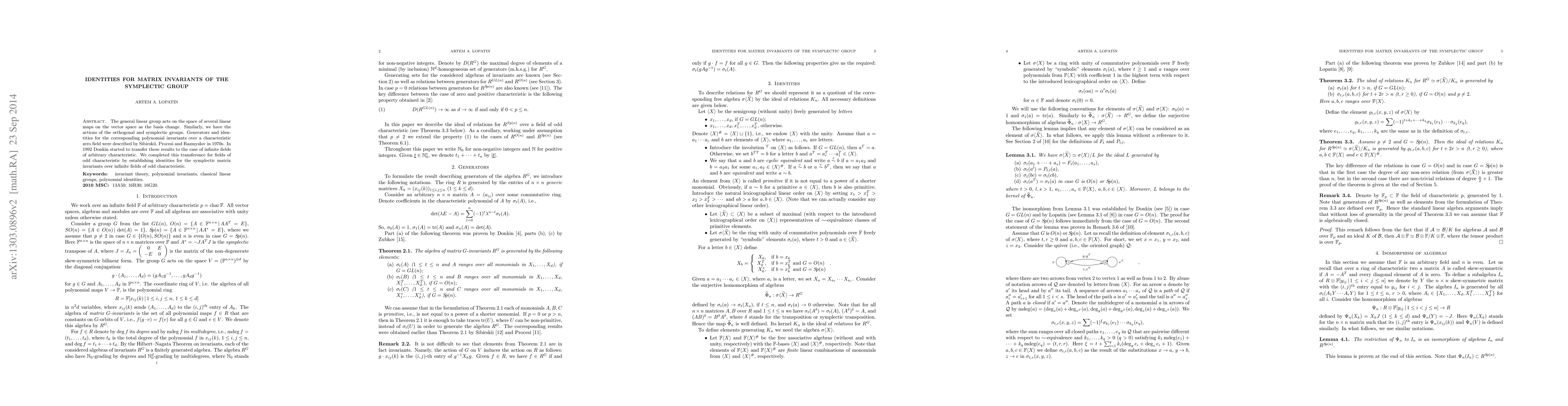 The general linear group acts on the space of several linear maps on the vector space as the basis change. Similarly, we have the actions of the orthogonal and symplectic groups. Generators and identities for the corresponding polynomial invariants over a characteristic zero field were described by Sibirskii, Procesi and Razmyslov in 1970s. In 1992 Donkin started to transfer these results to the case of infinite fields of arbitrary characteristic. We completed this transference for fields of odd characteristic by establishing identities for the symplectic matrix invariants over infinite fields of odd characteristic.