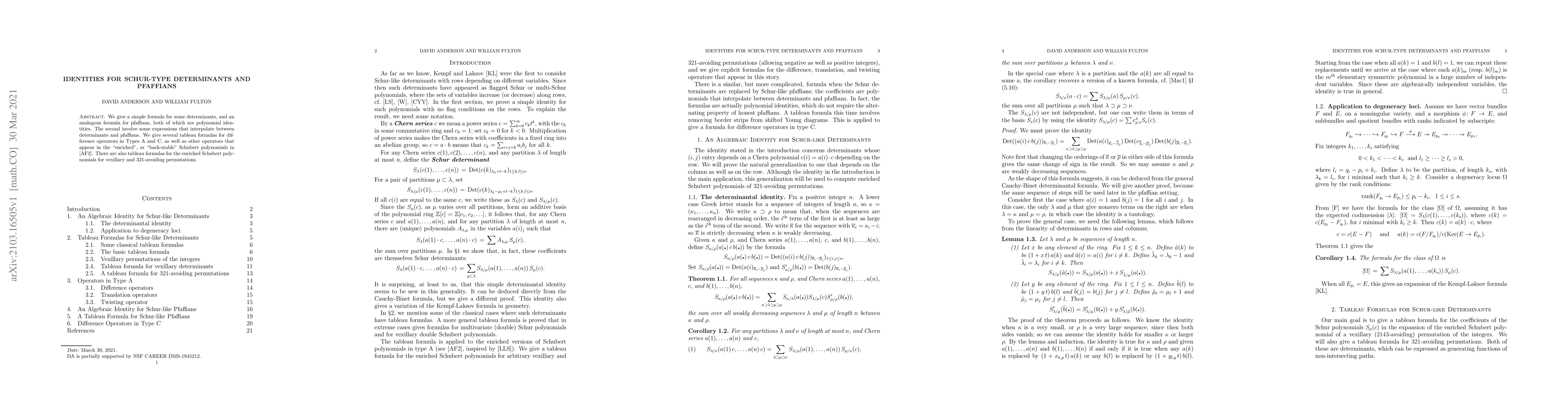 This paper presents polynomial identities for Schur-type determinants and pfaffians, including tableau formulas for difference operators in Types A and C, and enriched Schubert polynomials for specific permutation classes. The identities involve expressions that interpolate between determinants and pfaffians.