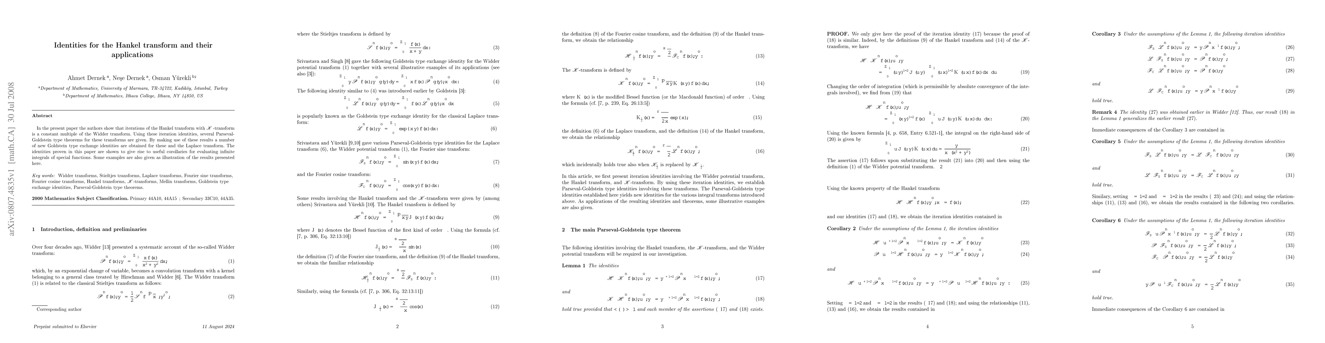Researchers prove new identities for the Hankel transform, linking it to the Widder transform and enabling useful applications in evaluating infinite integrals of special functions.