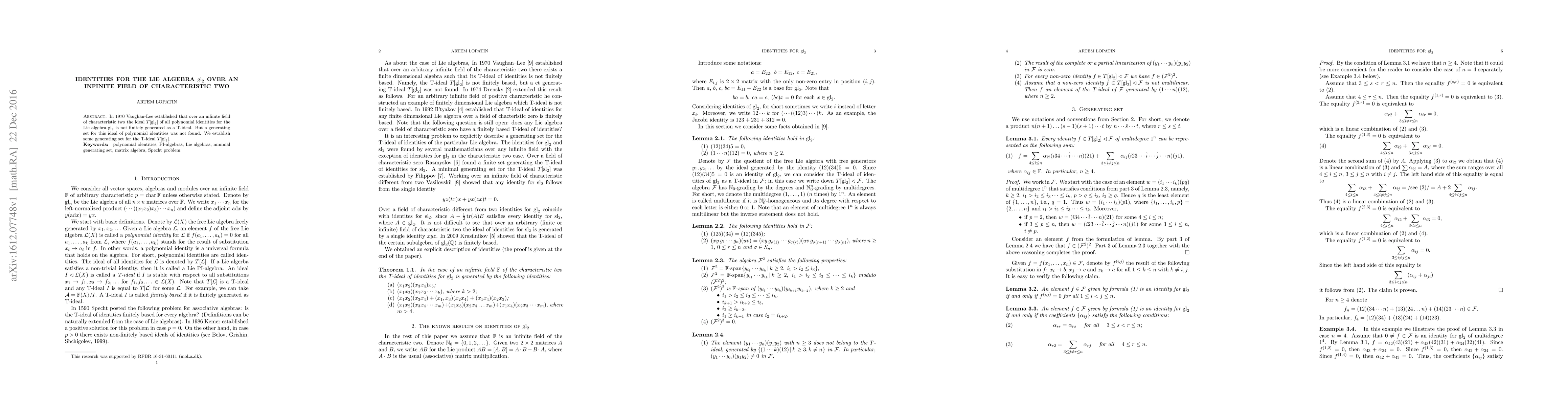 In 1970 Vaughan-Lee established that over an infinite field of characteristic two the ideal T[gl(2)] of all polynomial identities for the Lie algebra gl(2) is not finitely generated as a T-ideal. But a generating set for this ideal of polynomial identities was not found. We establish some generating set for the T-ideal T[gl(2)].