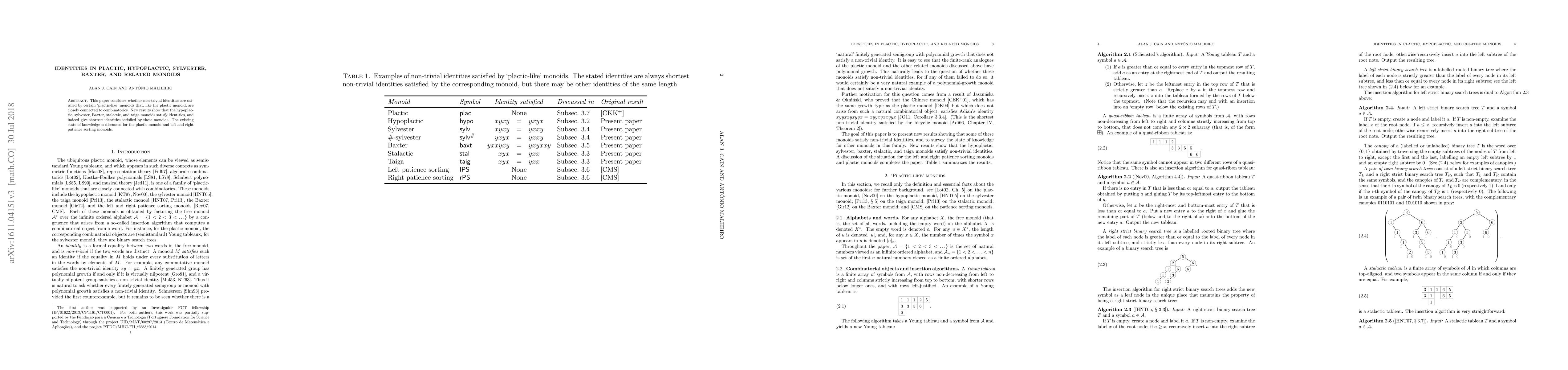 This paper investigates non-trivial identities in several plactic-like monoids, demonstrating that the hypoplactic, sylvester, Baxter, stalactic, and taiga monoids satisfy specific identities, and presents the shortest known identities for these monoids. It also reviews existing knowledge on the plactic monoid and sorting monoids.