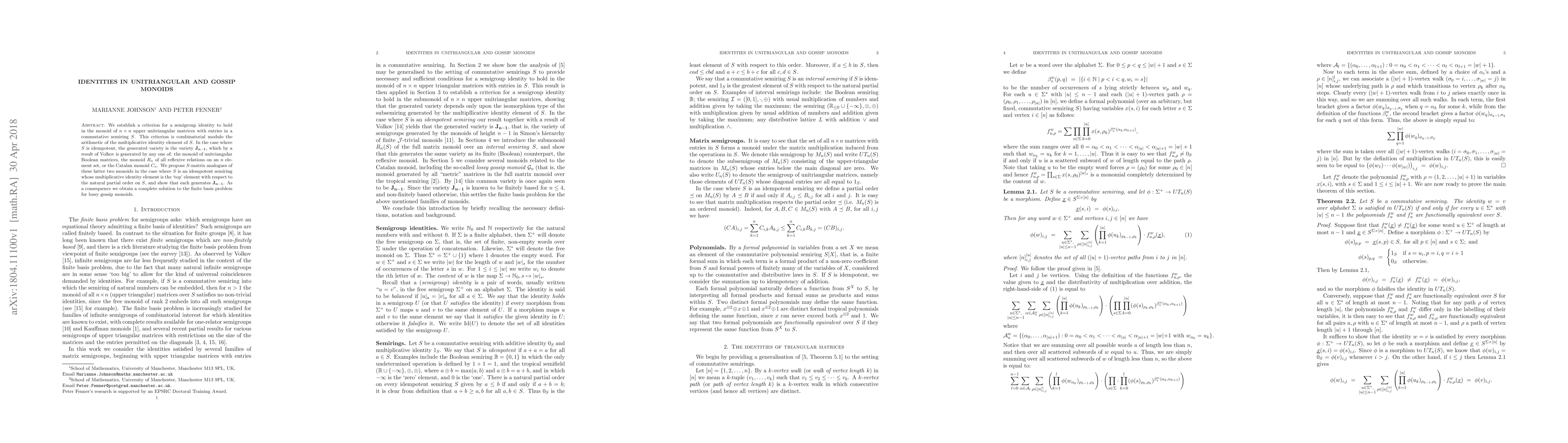This paper establishes a criterion for semigroup identities in the monoid of upper unitriangular matrices over a commutative semiring, proving that the generated variety $\mathbf{J_{n-1}}$ is also generated by specific matrix and relation monoids. It solves the finite basis problem for lossy gossip monoids.
