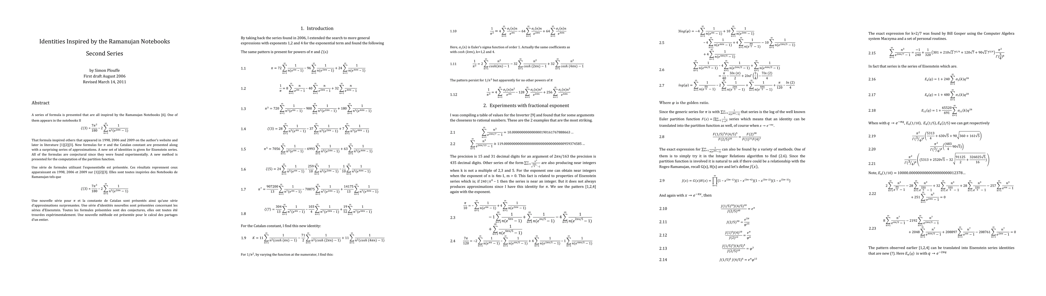 A series of formula is presented that are all inspired by the Ramanujan Notebooks [6]. One of them appears in the notebooks II about Zeta(3). That formula inspired others that appeared in 1998, 2006 and 2009 on the author's website and later in literature [1][2][3]. New formulas for {\pi} and the Catalan constant are presented and a surprising series of approximations. A new set of identities is given for Eisenstein series. All of the formulas are conjectural since they were found experimentally. A new method for the computation of p(n) is presented.