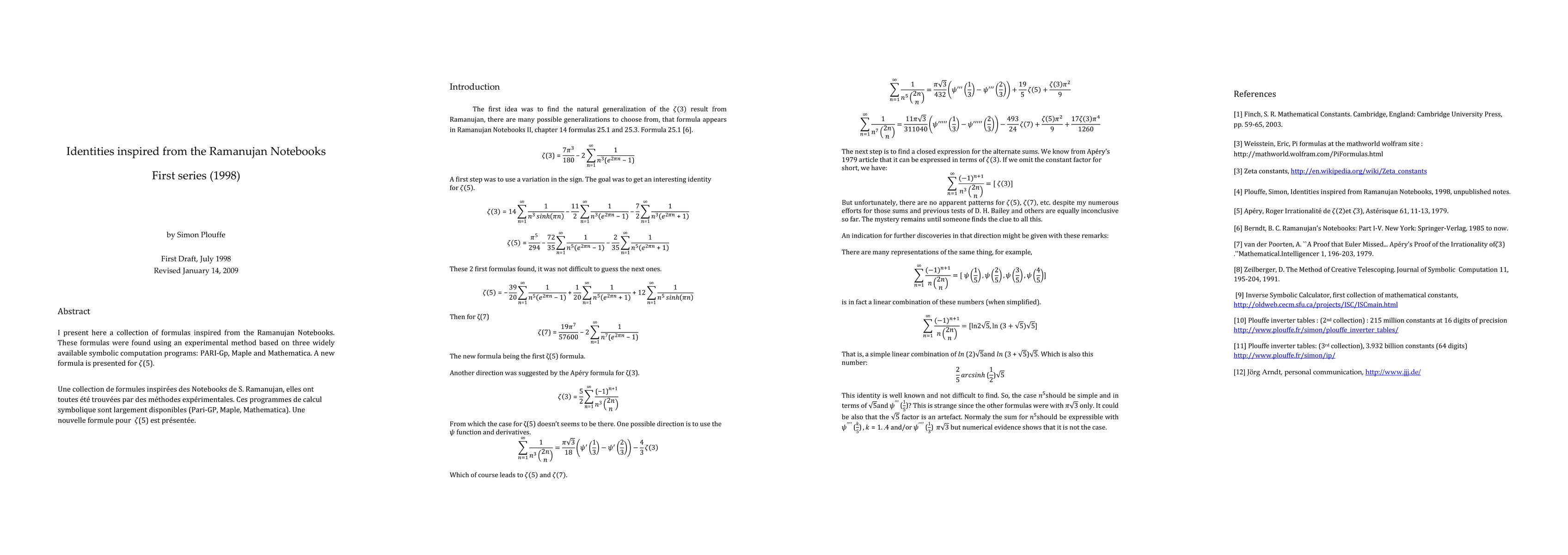 I present here a collection of formulas inspired from the Ramanujan Notebooks. These formulas were found using an experimental method based on three widely available symbolic computation programs: PARI-Gp, Maple and Mathematica. A new formula is presented for Zeta(5).