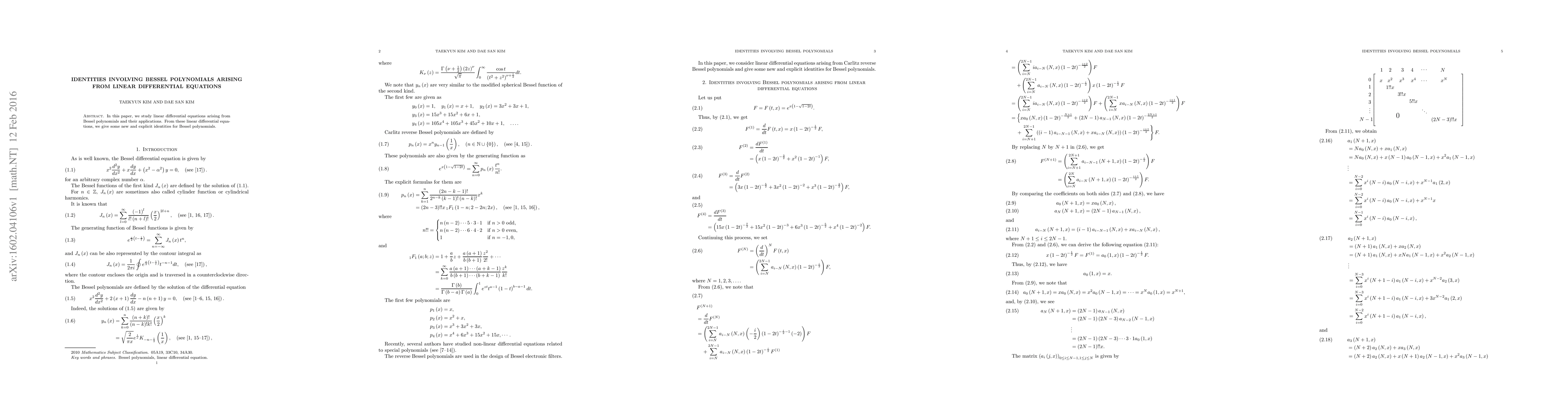 Summary: This paper investigates linear differential equations originating from Bessel polynomials and explores their applications. It presents new explicit identities for Bessel polynomials derived from these differential equations.