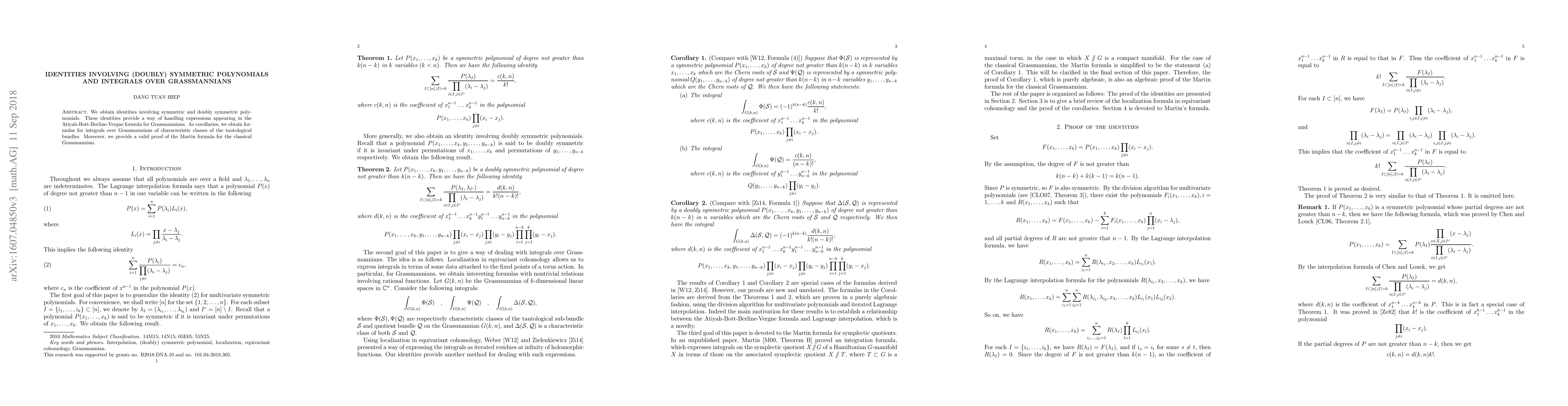 Researchers developed identities involving symmetric and doubly symmetric polynomials to simplify expressions in the Atiyah-Bott-Berline-Vergne formula for Grassmannians, leading to formulas for integrals over Grassmannians of characteristic classes and a proof of the Martin formula.
