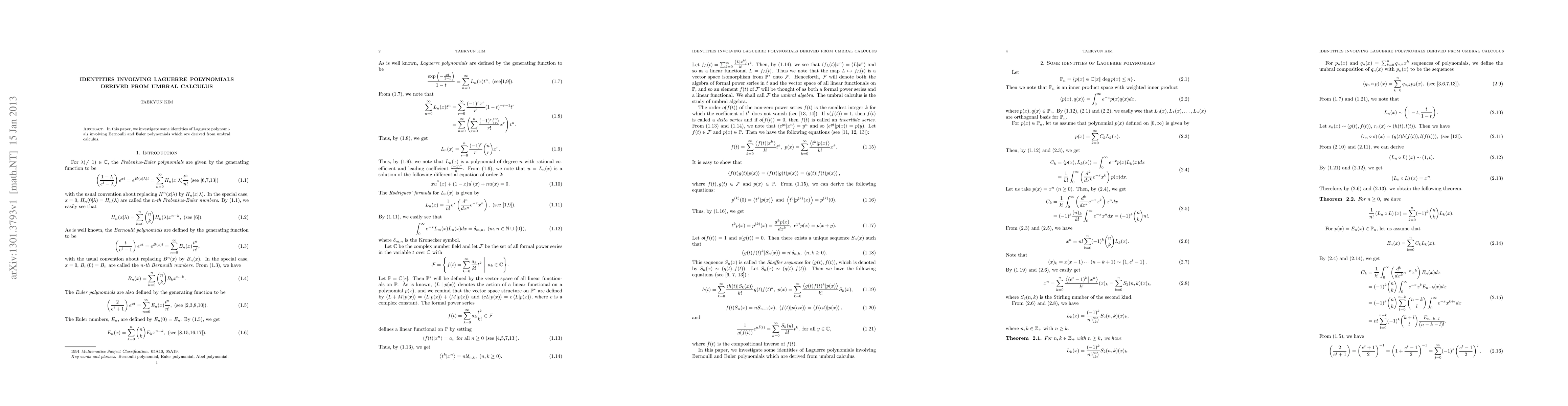 Summary: This paper explores new identities linking Laguerre polynomials with Bernoulli and Euler polynomials, utilizing techniques from umbral calculus to derive these relationships. The findings provide deeper insights into the combinatorial and analytical properties of Laguerre polynomials.