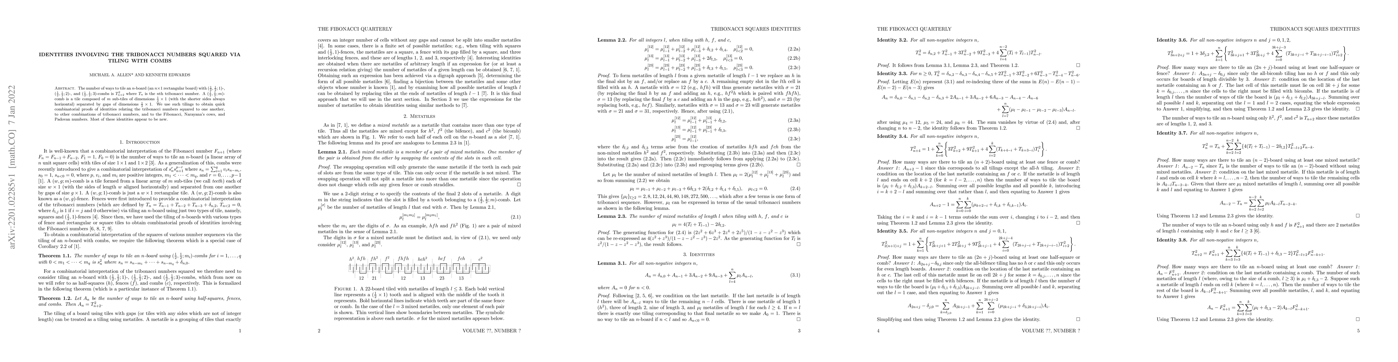 The paper explores combinatorial proofs for identities involving tribonacci numbers squared through tiling an $n$-board with specific combs, revealing new connections to other sequences like Fibonacci, Narayana's cows, and Padovan numbers. These identities are derived using tiling techniques with $(\frac12,\frac12;m)$-combs.