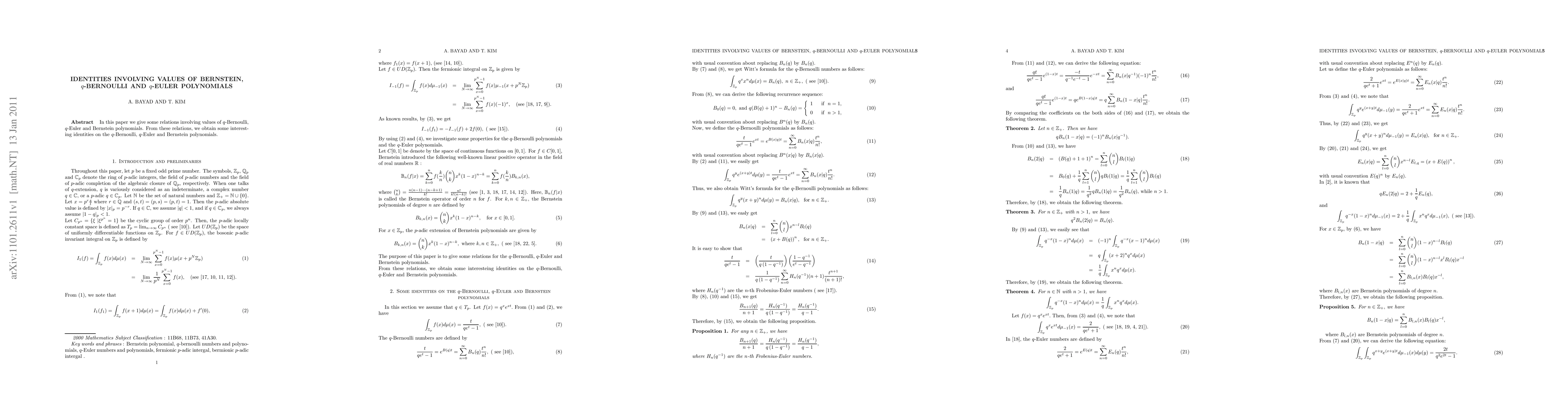 In this paper we give some relation involving values of q-Bernoulli, q-Euler and Bernstein polynomials. From these relations, we obtain some interesting identities on the q-Bernoulli, q-Euler and Bernstein polynomials.