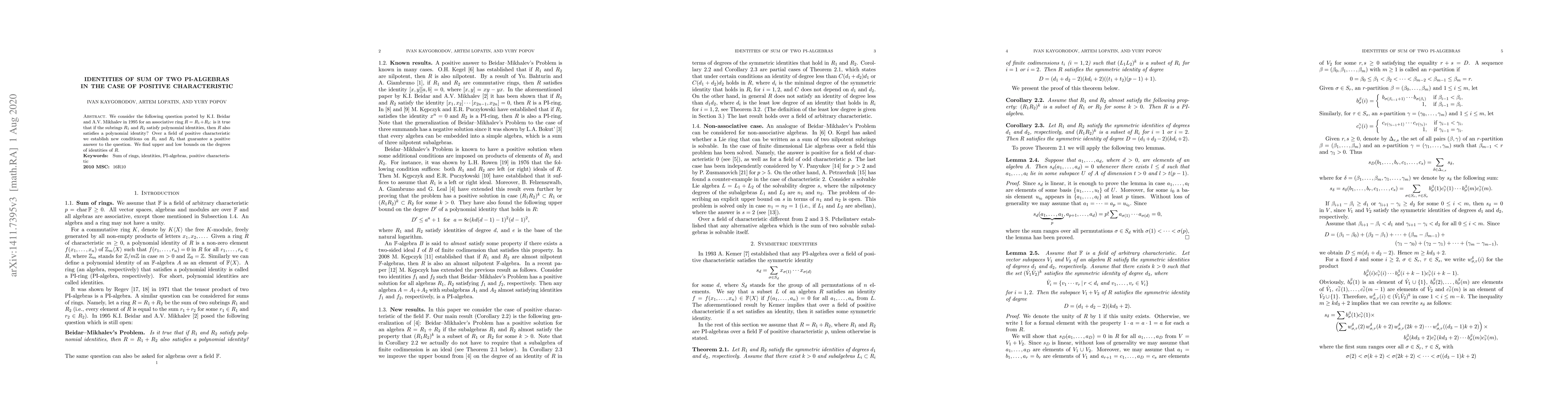 We consider the following question posted by K.I. Beidar and A.V. Mikhalev in 1995 for an associative ring $R=R_1+R_2$: is it true that if the subrings $R_1$ and $R_2$ satisfy polynomial identities, then $R$ also satisfies a polynomial identity? Over a field of positive characteristic we establish new conditions on $R_1$ and $R_2$ that guarantee a positive answer to the question. We find upper and low bounds on the degrees of identities of $R$.