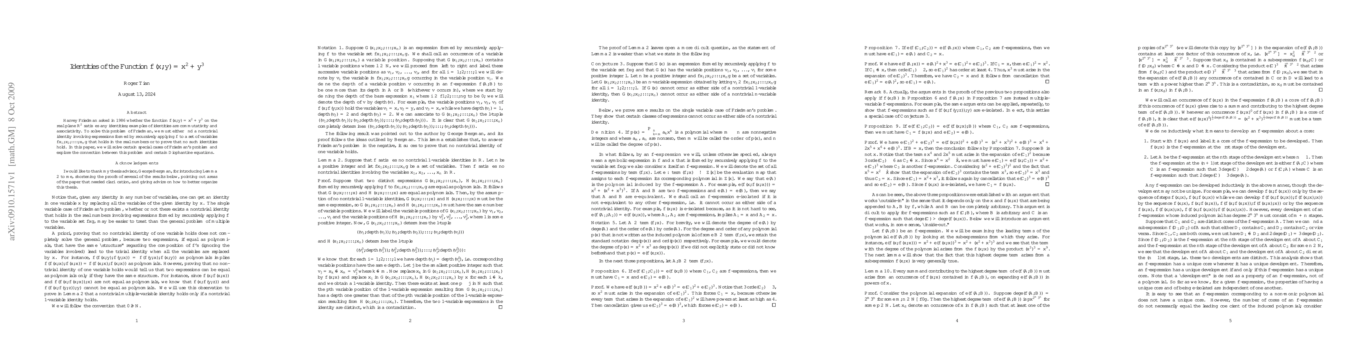 Harvey Friedman asked in 1986 whether the function f(x,y) = x^2 + y^3 on the real plane R^2 satisfies any identities; examples of identities are commutativity and associativity. To solve this problem of Friedman, we must either find a nontrivial identity involving expressions formed by recursively applying f to a set of variables {x_1,x_2, ..., x_n} that holds in the real numbers or to prove that no such identities hold. In this paper, we will solve certain special cases of Friedman's problem and explore the connection between this problem and certain Diophantine equations.
