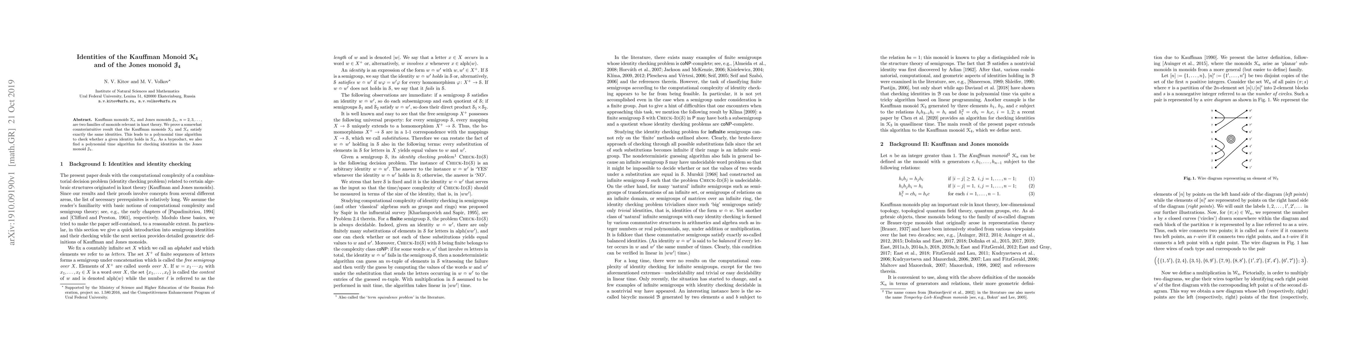 Kauffman monoids $\mathcal{K}_n$ and Jones monoids $\mathcal{J}_n$, $n=2,3,\dots$, are two families of monoids relevant in knot theory. We prove a somewhat counterintuitive result that the Kauffman monoids $\mathcal{K}_3$ and $\mathcal{K}_4$ satisfy exactly the same identities. This leads to a polynomial time algorithm to check whether a given identity holds in $\mathcal{K}_4$. As a byproduct, we also find a polynomial time algorithm for checking identities in the Jones monoid $\mathcal{J}_4$.