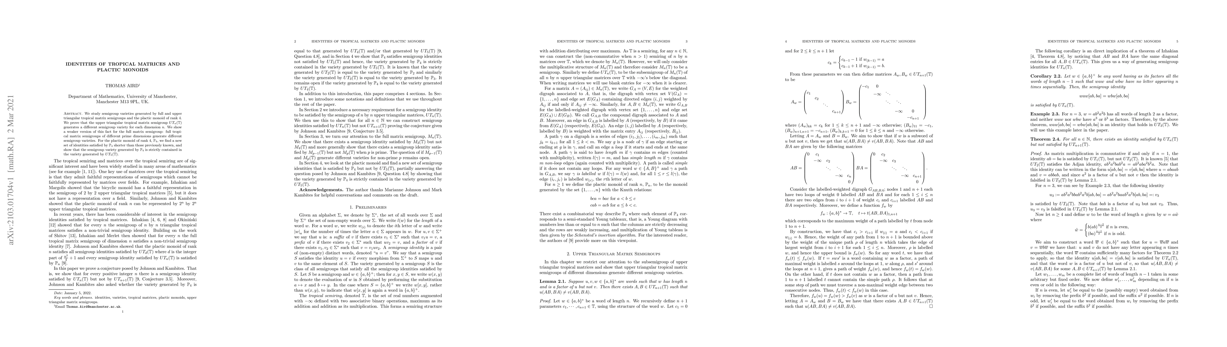 We study semigroup varieties generated by full and upper triangular tropical matrix semigroups and the plactic monoid of rank 4. We prove that the upper triangular tropical matrix semigroup $UT_n(\mathbb{T})$ generates a different semigroup variety for each dimension $n$. We show a weaker version of this fact for the full matrix semigroup: full tropical matrix semigroups of different prime dimensions generate different semigroup varieties. For the plactic monoid of rank 4, $\mathbb{P}_4$, we find a new set of identities satisfied by $\mathbb{P}_4$ shorter than those previously known, and show that the semigroup variety generated by $\mathbb{P}_4$ is strictly contained in the variety generated by $UT_5(\mathbb{T})$.