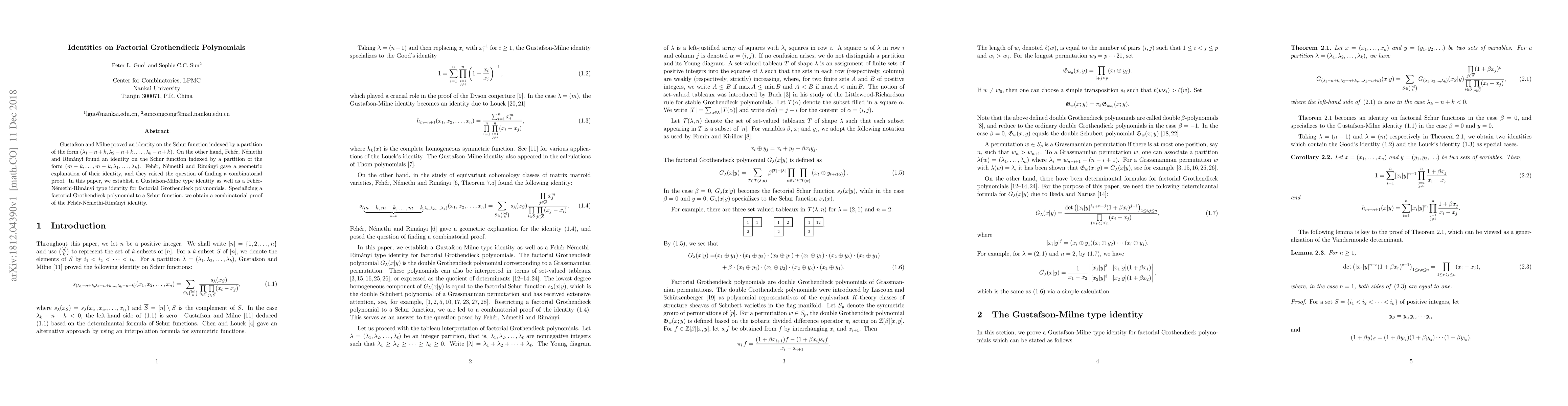 Gustafson and Milne proved an identity on the Schur function indexed by a partition of the form $(\lambda_1-n+k,\lambda_2-n+k,\ldots,\lambda_k-n+k)$. On the other hand, Feh\'{e}r, N\'{e}methi and Rim\'{a}nyi found an identity on the Schur function indexed by a partition of the form $(m-k,\ldots,m-k, \lambda_1,\ldots,\lambda_k)$. Feh\'{e}r, N\'{e}methi and Rim\'{a}nyi gave a geometric explanation of their identity, and they raised the question of finding a combinatorial proof. In this paper, we establish a Gustafson-Milne type identity as well as a Feh\'{e}r-N\'{e}methi-Rim\'{a}nyi type identity for factorial Grothendieck polynomials. Specializing a factorial Grothendieck polynomial to a Schur function, we obtain a combinatorial proof of the Feh\'{e}r-N\'{e}methi-Rim\'{a}nyi identity.