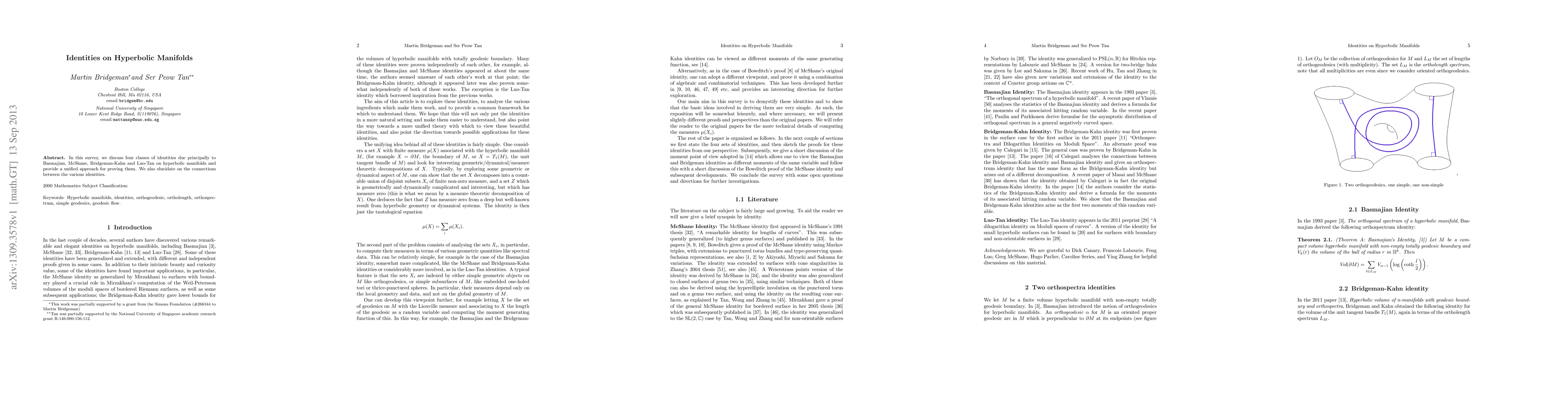 This paper surveys four classes of identities on hyperbolic manifolds, primarily due to Basmajian, McShane, Bridgeman-Kahn, and Luo-Tan, and presents a unified approach for their proofs. It also explores the connections and relationships between these identities.