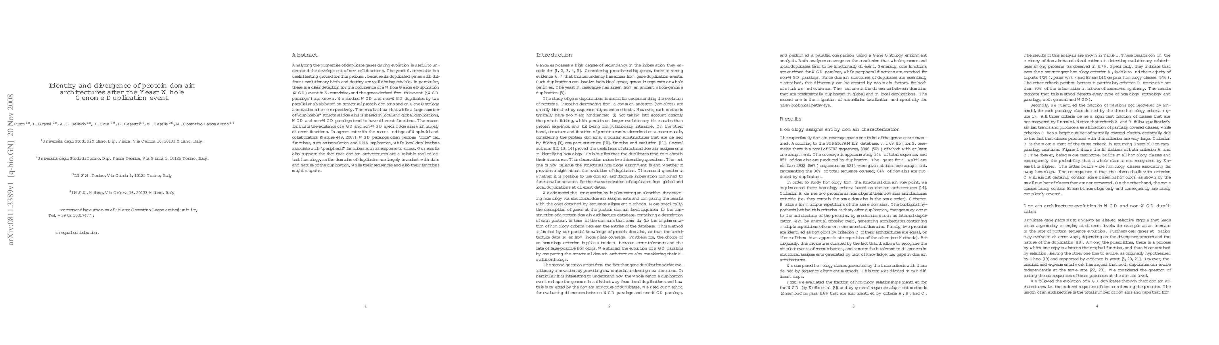 This paper explores the identity and divergence of protein domain architectures in yeast following a Whole Genome Duplication event. It finds that while many duplicable domains are shared, WGD and non-WGD paralogs exhibit different functions, with WGD paralogs often associated with core cellular functions and non-WGD paralogs linked to peripheral functions like stress response.