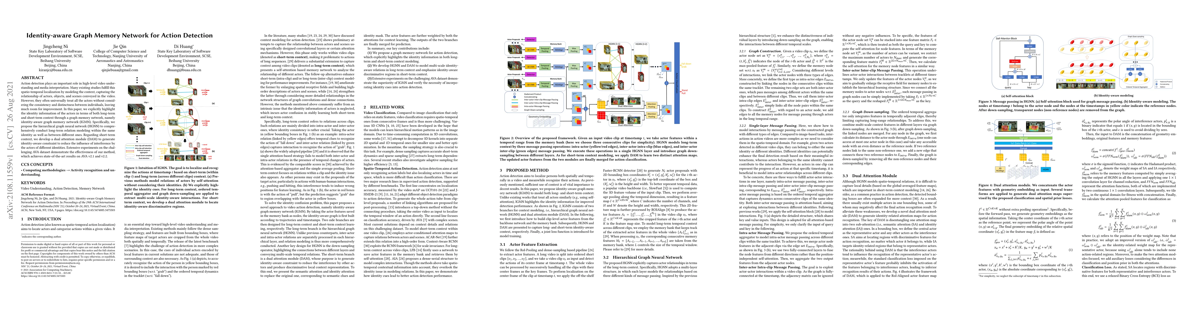 Action detection plays an important role in high-level video understanding and media interpretation. Many existing studies fulfill this spatio-temporal localization by modeling the context, capturing the relationship of actors, objects, and scenes conveyed in the video. However, they often universally treat all the actors without considering the consistency and distinctness between individuals, leaving much room for improvement. In this paper, we explicitly highlight the identity information of the actors in terms of both long-term and short-term context through a graph memory network, namely identity-aware graph memory network (IGMN). Specifically, we propose the hierarchical graph neural network (HGNN) to comprehensively conduct long-term relation modeling within the same identity as well as between different ones. Regarding short-term context, we develop a dual attention module (DAM) to generate identity-aware constraint to reduce the influence of interference by the actors of different identities. Extensive experiments on the challenging AVA dataset demonstrate the effectiveness of our method, which achieves state-of-the-art results on AVA v2.1 and v2.2.