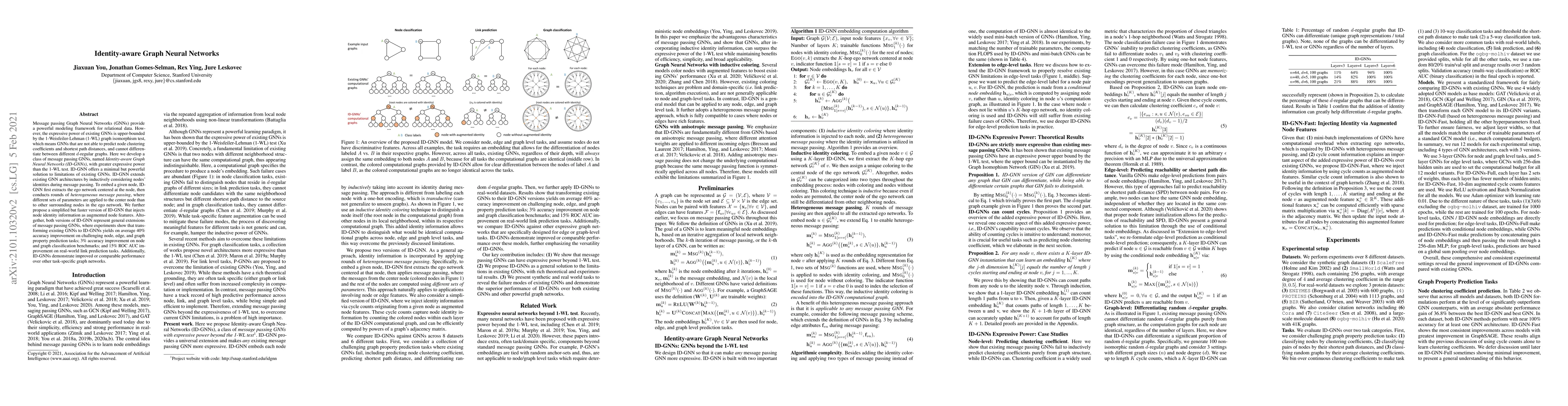 Identity-aware Graph Neural Networks (ID-GNNs) extend traditional GNNs by incorporating node identities during message passing, achieving greater expressive power beyond the 1-WL test. Experiments show significant improvements in various node, edge, and graph property prediction tasks.