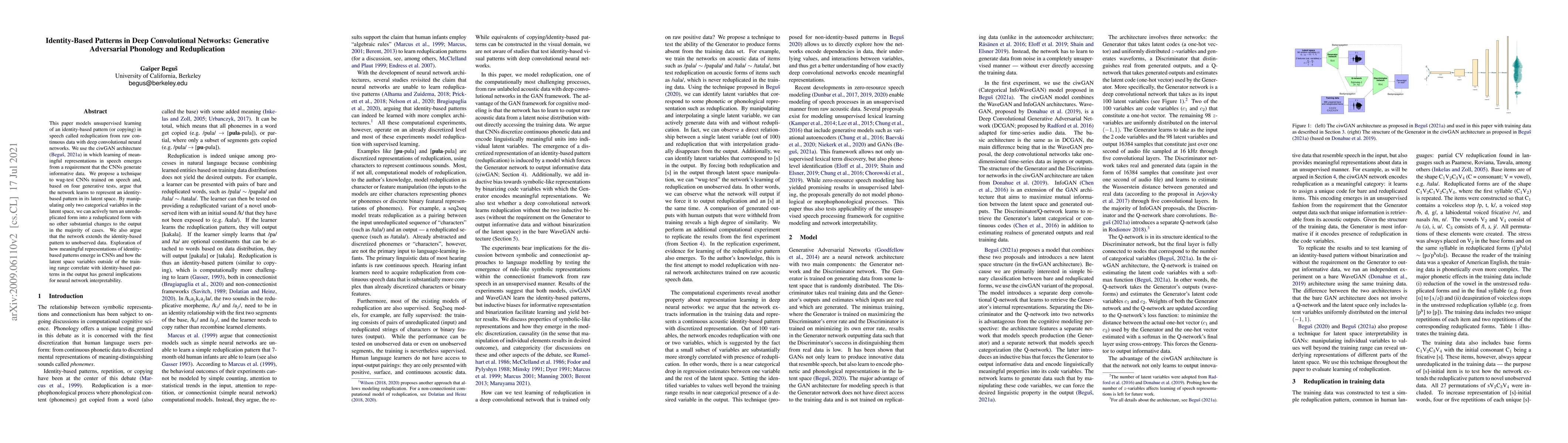 This paper models unsupervised learning of an identity-based pattern (or copying) in speech called reduplication from raw continuous data with deep convolutional neural networks. We use the ciwGAN architecture Begu\v{s} (2021a; arXiv:2006.02951) in which learning of meaningful representations in speech emerges from a requirement that the CNNs generate informative data. We propose a technique to wug-test CNNs trained on speech and, based on four generative tests, argue that the network learns to represent an identity-based pattern in its latent space. By manipulating only two categorical variables in the latent space, we can actively turn an unreduplicated form into a reduplicated form with no other substantial changes to the output in the majority of cases. We also argue that the network extends the identity-based pattern to unobserved data. Exploration of how meaningful representations of identity-based patterns emerge in CNNs and how the latent space variables outside of the training range correlate with identity-based patterns in the output has general implications for neural network interpretability.