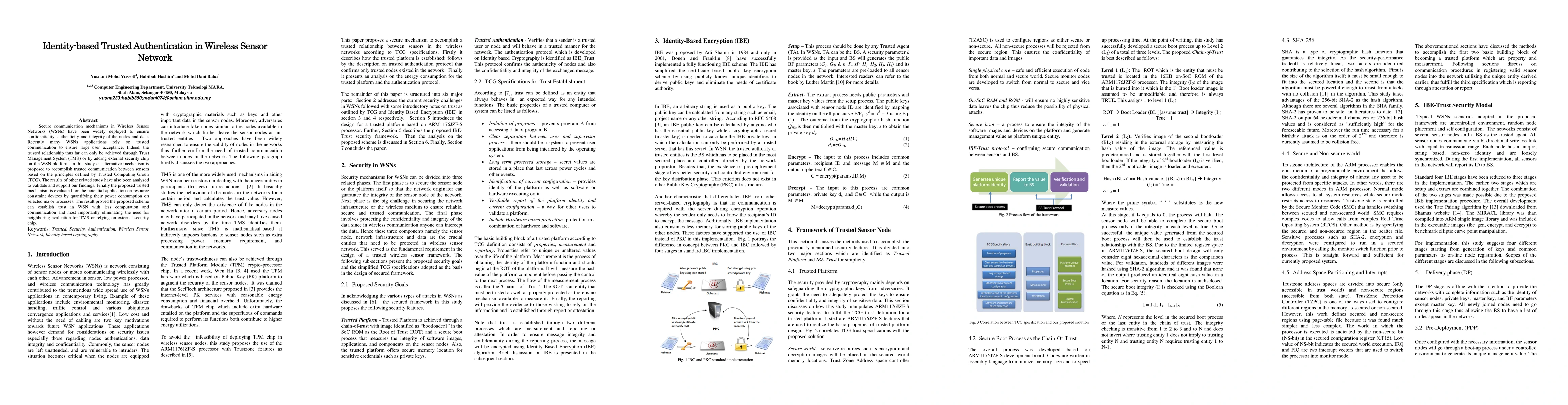 This paper proposes an alternative identity-based trusted authentication mechanism for Wireless Sensor Networks (WSNs) based on Trusted Computing Group principles, eliminating the need for Trust Management Systems or external security chips. The proposed method is evaluated for power consumption, demonstrating its feasibility for resource-constrained devices.