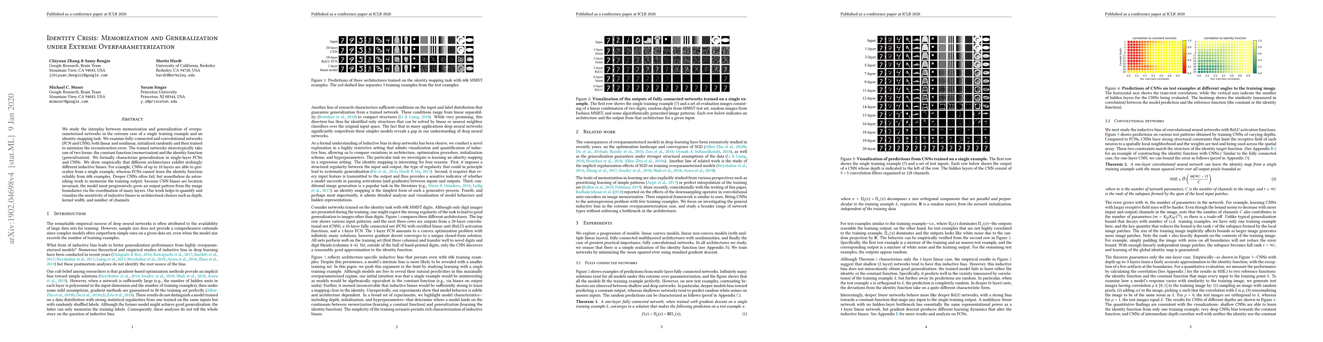 We study the interplay between memorization and generalization of overparameterized networks in the extreme case of a single training example and an identity-mapping task. We examine fully-connected and convolutional networks (FCN and CNN), both linear and nonlinear, initialized randomly and then trained to minimize the reconstruction error. The trained networks stereotypically take one of two forms: the constant function (memorization) and the identity function (generalization). We formally characterize generalization in single-layer FCNs and CNNs. We show empirically that different architectures exhibit strikingly different inductive biases. For example, CNNs of up to 10 layers are able to generalize from a single example, whereas FCNs cannot learn the identity function reliably from 60k examples. Deeper CNNs often fail, but nonetheless do astonishing work to memorize the training output: because CNN biases are location invariant, the model must progressively grow an output pattern from the image boundaries via the coordination of many layers. Our work helps to quantify and visualize the sensitivity of inductive biases to architectural choices such as depth, kernel width, and number of channels.