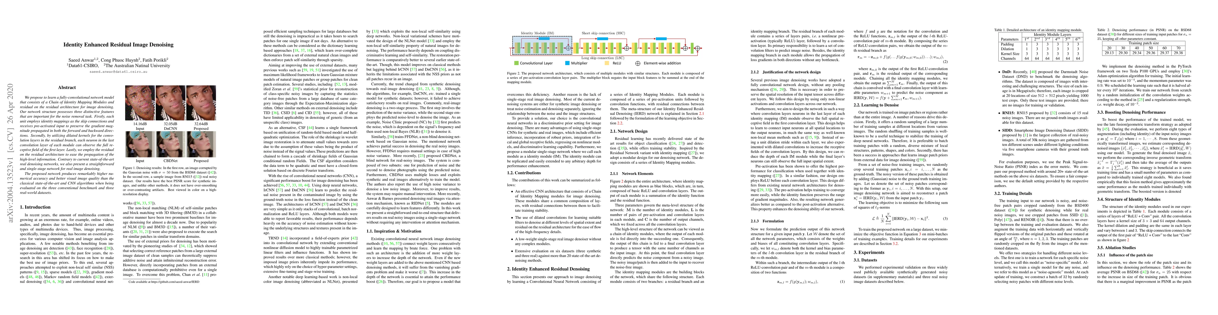This paper introduces a fully-convolutional network for image denoising that uses a Chain of Identity Mapping Modules and residual on the residual architecture. The network preserves gradient magnitude and employs dilated kernels, achieving higher accuracy and better visual quality compared to existing methods.