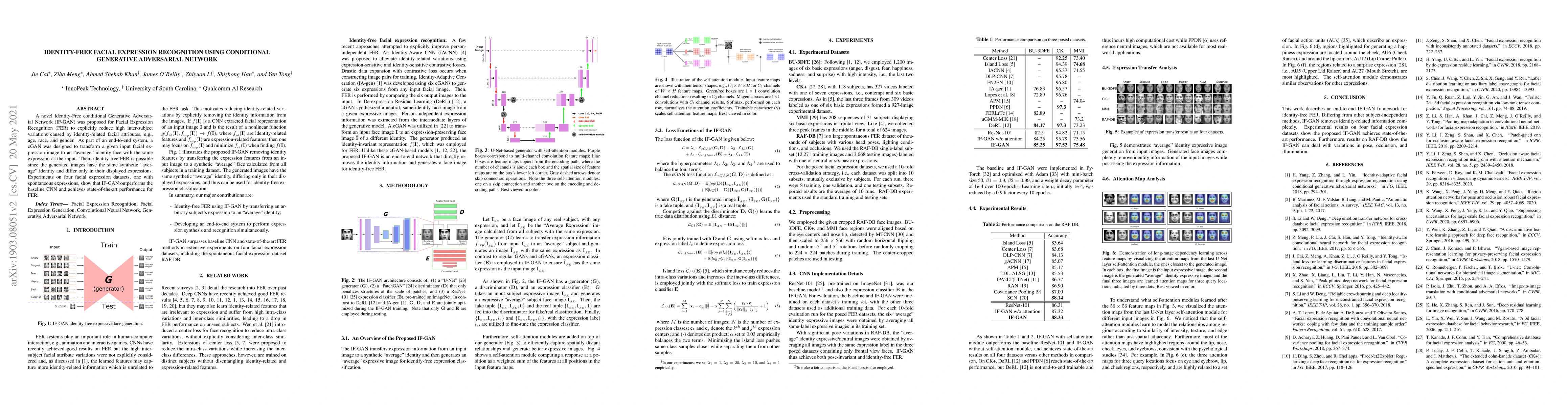 This paper proposes an Identity-Free conditional Generative Adversarial Network (IF-GAN) for Facial Expression Recognition (FER) that reduces inter-subject variations by transforming input images to an "average" identity face. Experiments show IF-GAN outperforms baseline CNNs and achieves state-of-the-art results on multiple datasets.