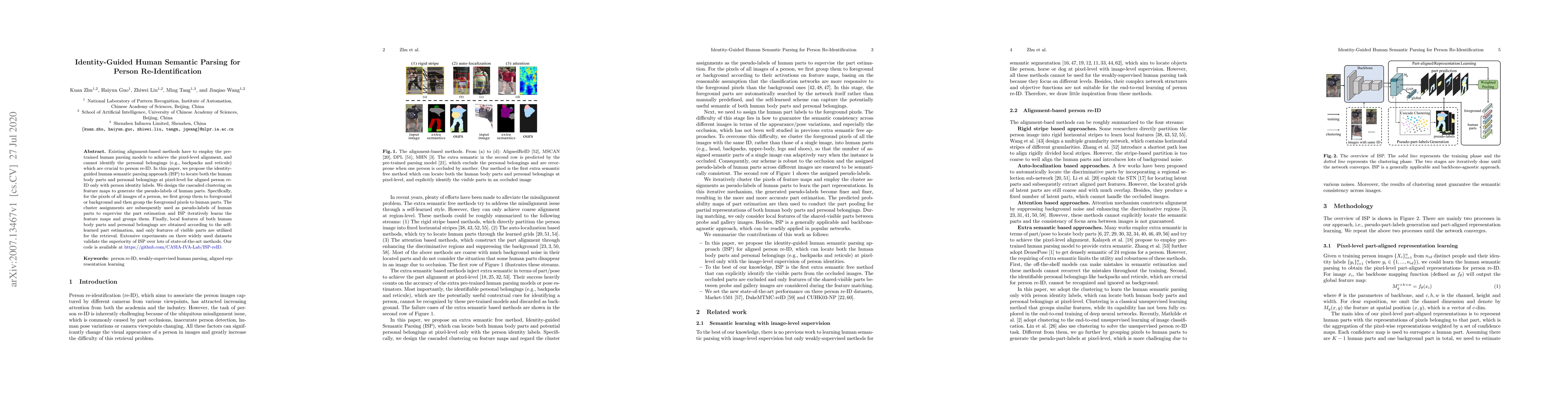 Existing alignment-based methods have to employ the pretrained human parsing models to achieve the pixel-level alignment, and cannot identify the personal belongings (e.g., backpacks and reticule) which are crucial to person re-ID. In this paper, we propose the identity-guided human semantic parsing approach (ISP) to locate both the human body parts and personal belongings at pixel-level for aligned person re-ID only with person identity labels. We design the cascaded clustering on feature maps to generate the pseudo-labels of human parts. Specifically, for the pixels of all images of a person, we first group them to foreground or background and then group the foreground pixels to human parts. The cluster assignments are subsequently used as pseudo-labels of human parts to supervise the part estimation and ISP iteratively learns the feature maps and groups them. Finally, local features of both human body parts and personal belongings are obtained according to the selflearned part estimation, and only features of visible parts are utilized for the retrieval. Extensive experiments on three widely used datasets validate the superiority of ISP over lots of state-of-the-art methods. Our code is available at https://github.com/CASIA-IVA-Lab/ISP-reID.
