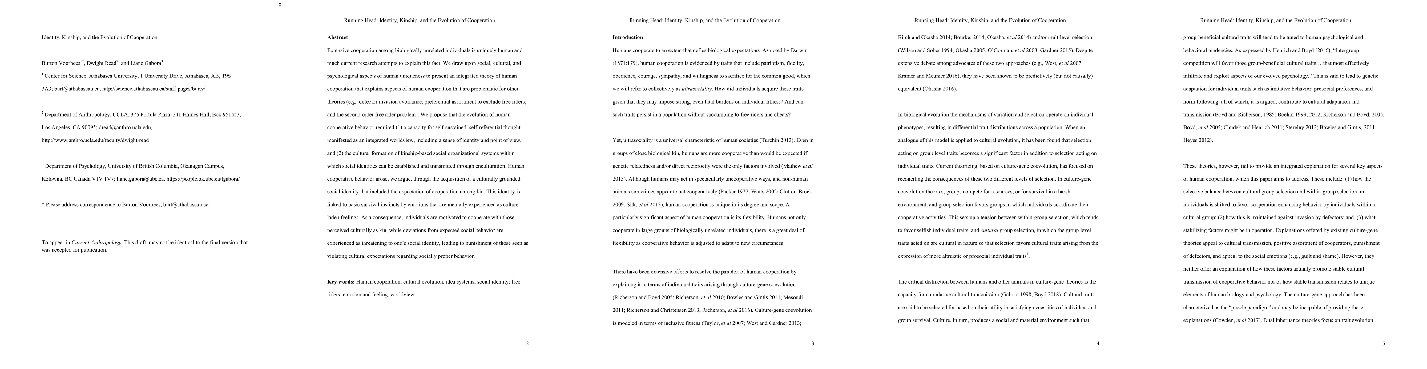 Extensive cooperation among biologically unrelated individuals is uniquely human and much current research attempts to explain this fact. We draw upon social, cultural, and psychological aspects of human uniqueness to present an integrated theory of human cooperation that explains aspects of human cooperation that are problematic for other theories (e.g., defector invasion avoidance, preferential assortment to exclude free riders, and the second order free rider problem). We propose that the evolution of human cooperative behavior required (1) a capacity for self-sustained, self-referential thought manifested as an integrated worldview, including a sense of identity and point of view, and (2) the cultural formation of kinship-based social organizational systems within which social identities can be established and transmitted through enculturation. Human cooperative behavior arose, we argue, through the acquisition of a culturally grounded social identity that included the expectation of cooperation among kin. This identity is linked to basic survival instincts by emotions that are mentally experienced as culture laden feelings. As a consequence, individuals are motivated to cooperate with those perceived culturally as kin, while deviations from expected social behavior are experienced as threatening to one's social identity, leading to punishment of those seen as violating cultural expectations regarding socially proper behavior.