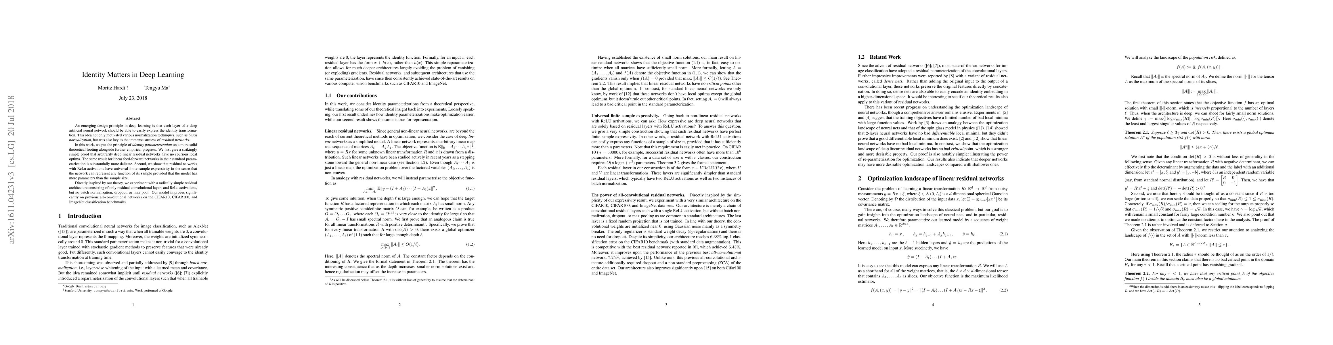 This paper explores the principle of identity parameterization in deep learning, proving that deep residual networks have no spurious local optima and exhibit universal finite-sample expressivity. It introduces a simple residual architecture that outperforms previous models on several image classification benchmarks.