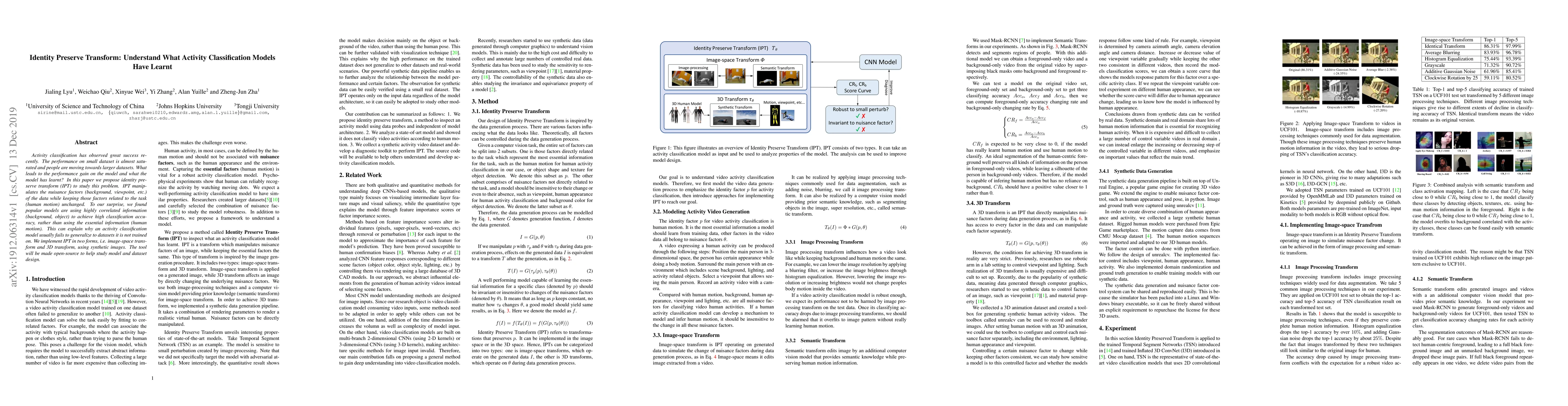 Activity classification has observed great success recently. The performance on small dataset is almost saturated and people are moving towards larger datasets. What leads to the performance gain on the model and what the model has learnt? In this paper we propose identity preserve transform (IPT) to study this problem. IPT manipulates the nuisance factors (background, viewpoint, etc.) of the data while keeping those factors related to the task (human motion) unchanged. To our surprise, we found popular models are using highly correlated information (background, object) to achieve high classification accuracy, rather than using the essential information (human motion). This can explain why an activity classification model usually fails to generalize to datasets it is not trained on. We implement IPT in two forms, i.e. image-space transform and 3D transform, using synthetic images. The tool will be made open-source to help study model and dataset design.