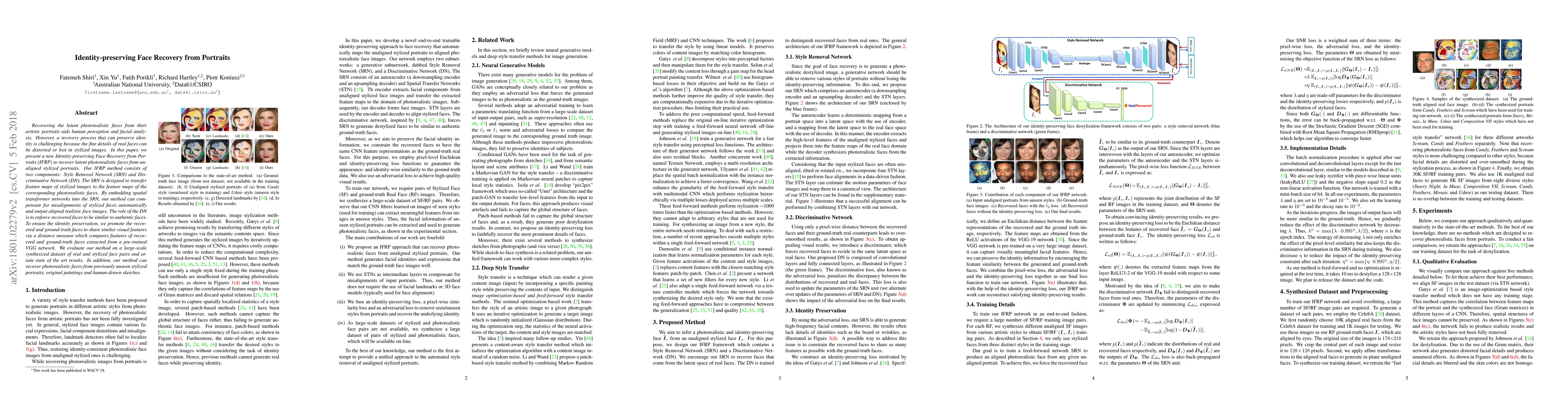 This paper introduces a new Identity-preserving Face Recovery from Portraits (IFRP) method to retrieve latent photorealistic faces from stylized portraits, preserving identity despite distortions. The method uses a Style Removal Network (SRN) and a Discriminative Network (DN) to align and enforce similarity to authentic faces, achieving state-of-the-art results on a synthesized dataset.