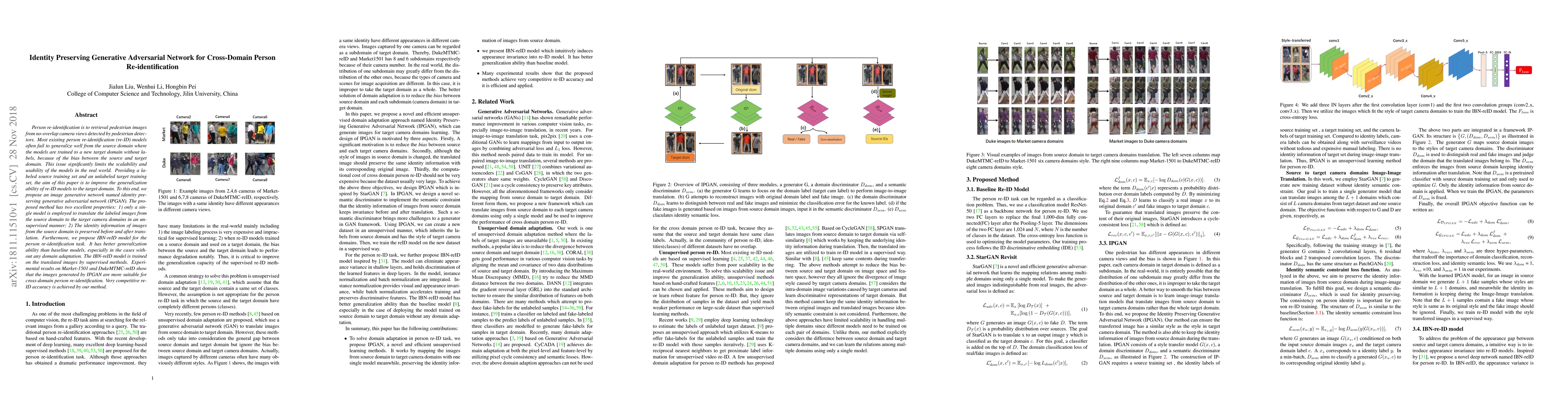This paper proposes an identity preserving generative adversarial network (IPGAN) to improve the generalization of person re-identification models across different camera domains. IPGAN translates images from a labeled source domain to an unlabeled target domain while preserving identity information, and the IBN-reID model trained on these translated images achieves better cross-domain re-identification accuracy compared to baseline models.