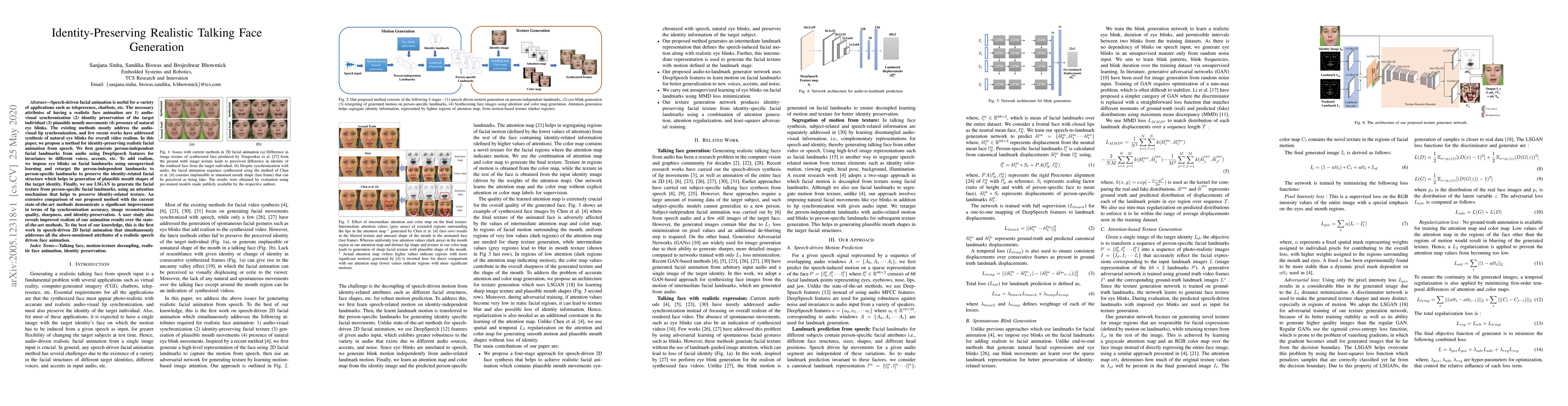This paper proposes a novel method for generating identity-preserving realistic talking faces by synchronizing speech with facial landmarks, ensuring natural eye blinks, and maintaining the target individual's identity through advanced deep learning techniques. The method significantly outperforms existing approaches in lip synchronization, image quality, and identity preservation, as demonstrated by both quantitative comparisons and user studies.