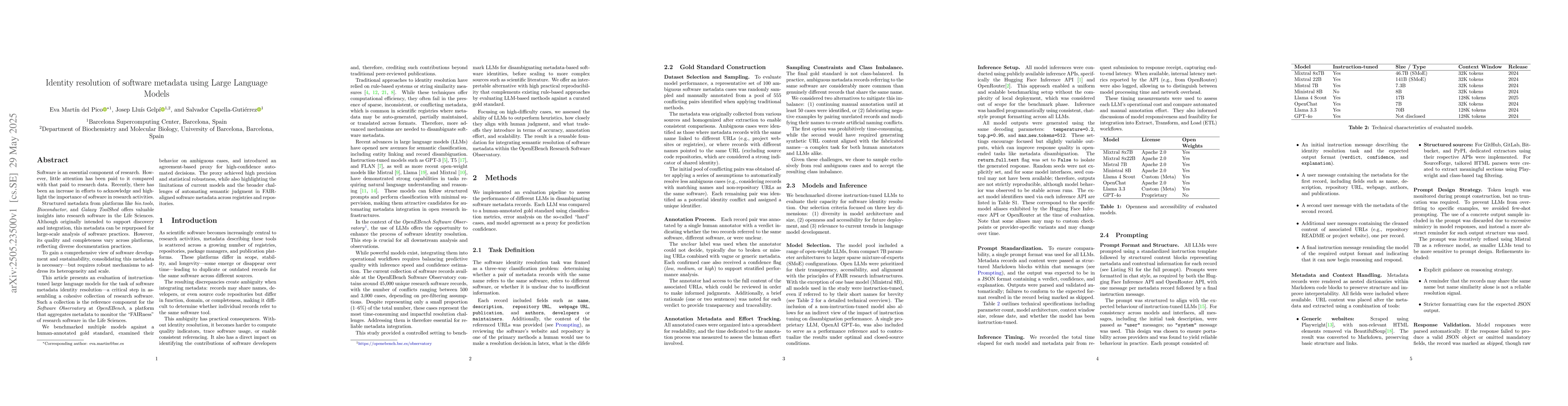 This work is novel in its application of instruction-tuned LLMs to software metadata identity resolution, its introduction of an agreement-based proxy for high-confidence automated decisions, and its exploration of the trade-offs between model size and performance in this specific task.