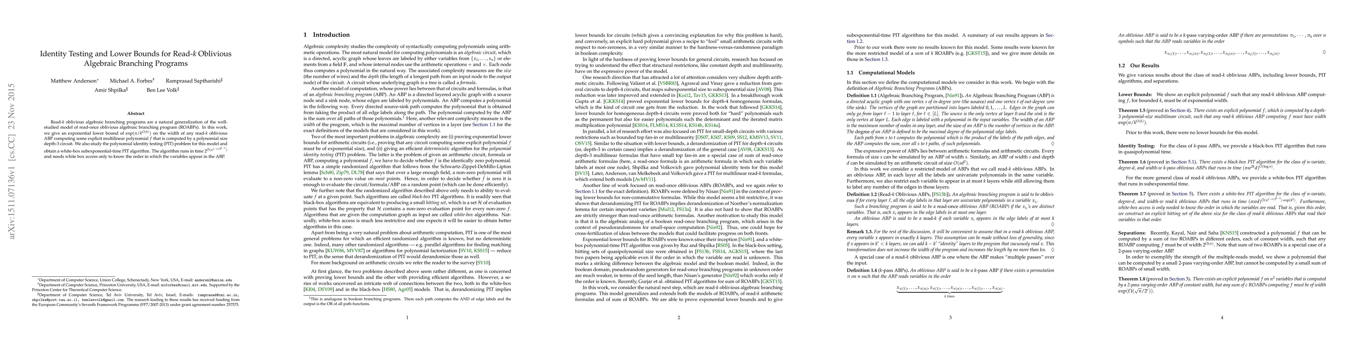 This paper establishes an exponential lower bound for the width of read-$k$ oblivious algebraic branching programs computing specific multilinear polynomials, and presents a subexponential-time white-box polynomial identity testing algorithm for this model.