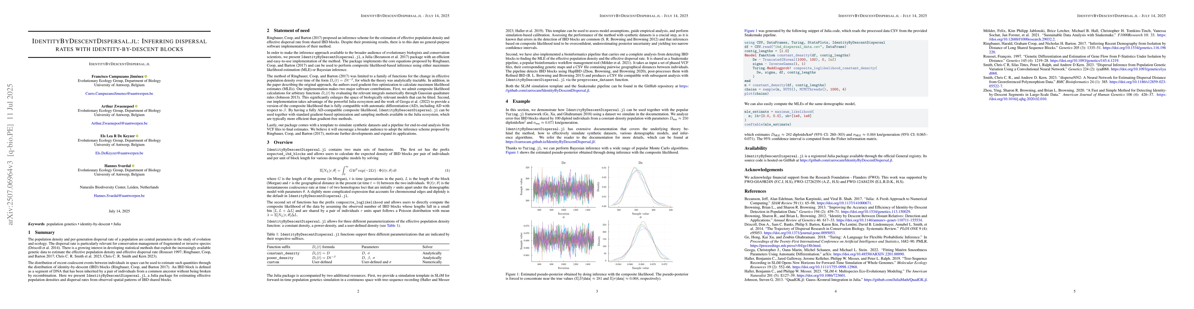 The population density and per-generation dispersal rate of a population are central parameters in the study of evolution and ecology. The distribution of recent coalescent events between individuals in space can be used to estimate such quantities through the distribution of identity-by-descent (IBD) blocks. An IBD block is defined as a segment of DNA that has been inherited by a pair of individuals from a common ancestor without being broken by recombination. We introduce a Julia package for estimating effective population densities and dispersal rates from observed spatial patterns of IBD shared blocks. It implements the inference scheme proposed by Ringbauer, Coop, and Barton (2017). The package provides a user-friendly interface, supports efficient gradient-based optimization and accommodates arbitrary user-defined demographic models through numerical integration. This software aims to encourage a wider audience to utilize spatial genetic data for estimating dispersal rates, thereby motivating further research and expanding its applications.
