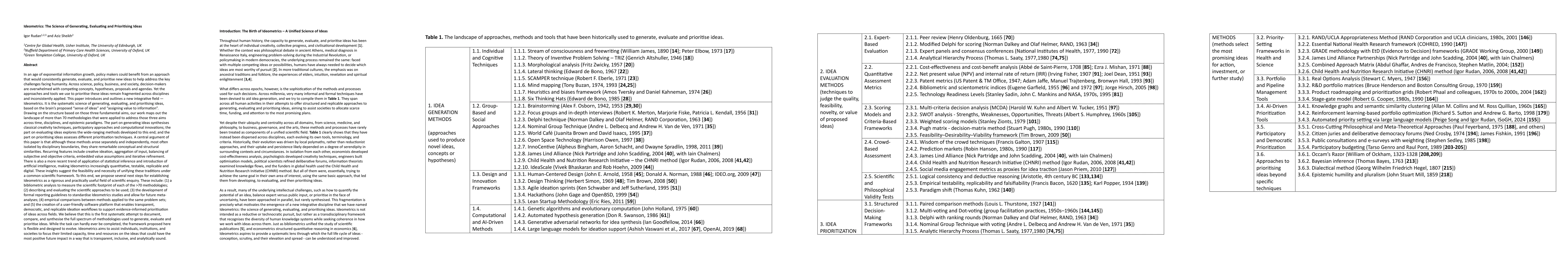 This paper introduces and outlines a new integrative field, Ideometrics. It is the systematic science of generating, evaluating, and prioritising ideas, based on the proposed sense of ideas and assigning value to information by the brain. Drawing on the structure based on the three fundamental aims, our work maps out the landscape of more than 70 methodologies that were applied to address those three aims across time, disciplines, and epistemic paradigms. The part on generating ideas synthesises classical creativity techniques, participatory approaches and computational innovations. The part on evaluating ideas explores the wide ranging methods developed to this end. The part on prioritising ideas assesses different prioritisation techniques. A central argument of this paper is that although these methods arose separately and independently, most often isolated by disciplinary boundaries, they share remarkable conceptual and structural similarities. Recurring features include creative ideation, aggregation of input, balancing of subjective and objective criteria, embedded value assumptions and iterative refinement. There is also a more recent trend of application of statistical inference and introduction of artificial intelligence, making Ideometrics increasingly quantitative, testable, replicable and digital. These insights suggest the feasibility and necessity of unifying these traditions under a common scientific framework, establishing Ideometrics as a rigorous and practically useful field of scientific enquiry. We believe that this is the first systematic attempt to document, compare, and synthesise the full spectrum of methodologies used to generate, evaluate and prioritise ideas. Our framework is flexible and designed to evolve, to assist in identifying the ideas that could have the most positive future impact in a way that is transparent, inclusive, and analytically sound.