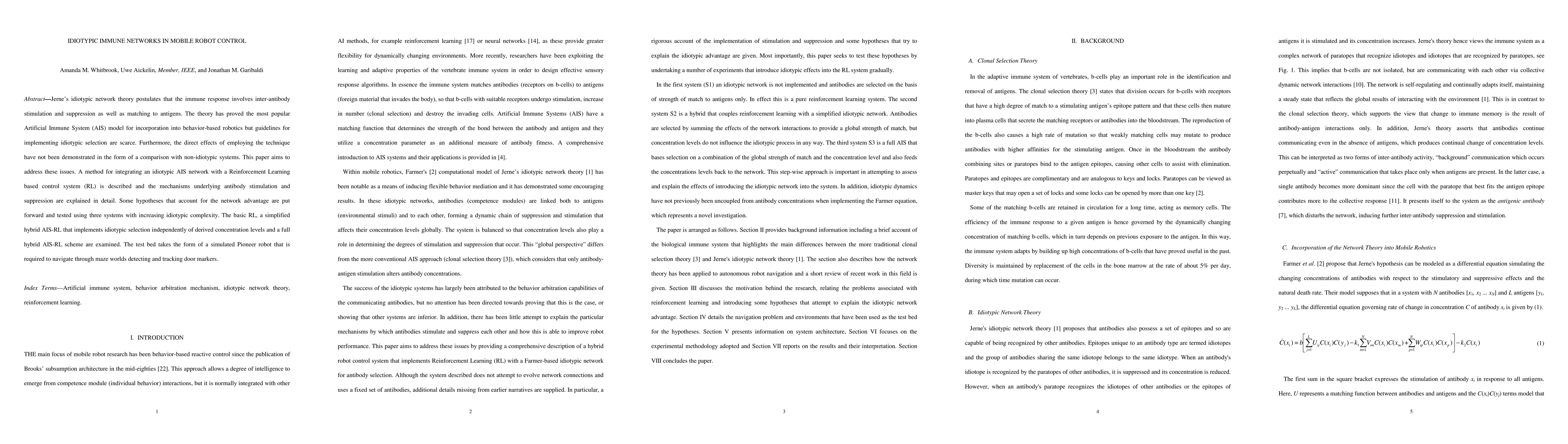 This paper explores the integration of Jerne's idiotypic network theory into mobile robot control using Reinforcement Learning, comparing its performance against non-idiotypic systems. It proposes a method for implementing idiotypic selection and tests hypotheses on network advantages through simulations of a Pioneer robot navigating mazes.