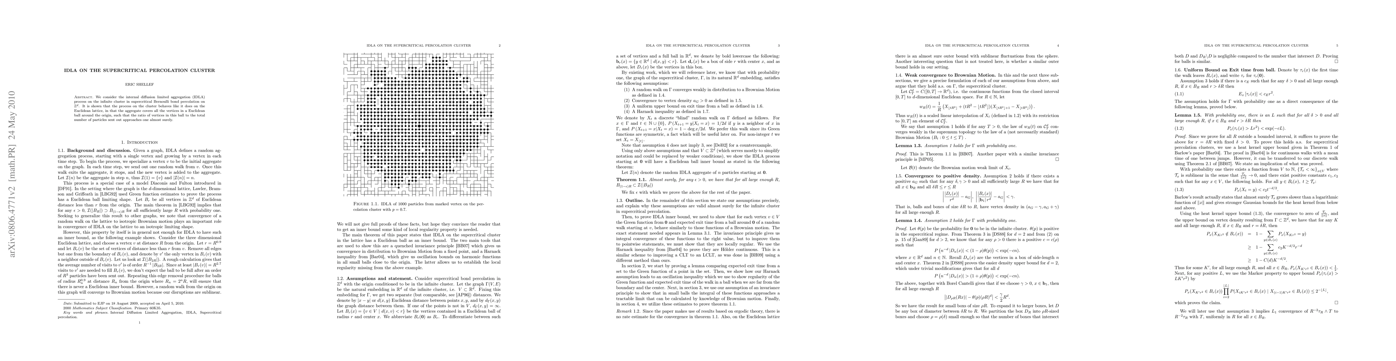 This paper investigates the internal diffusion limited aggregation (IDLA) on the infinite cluster of supercritical Bernoulli bond percolation in Euclidean lattices, demonstrating that the IDLA process behaves similarly to that on the lattice, with the aggregate covering all vertices in a ball around the origin, approaching a ratio of one almost surely.