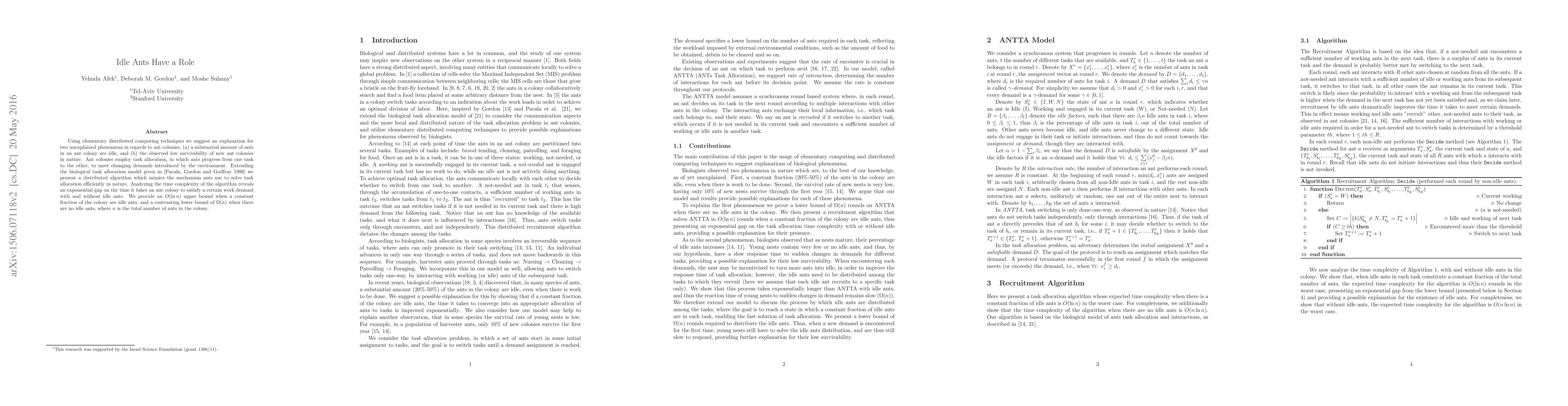 This paper proposes a distributed computing model to explain why a significant number of ants in a colony remain idle and how this impacts the survivability of new colonies. The analysis shows that idle ants significantly improve task allocation efficiency, reducing time complexity from $\Omega(n)$ to $O(\ln n)$ when a fraction of ants are idle.