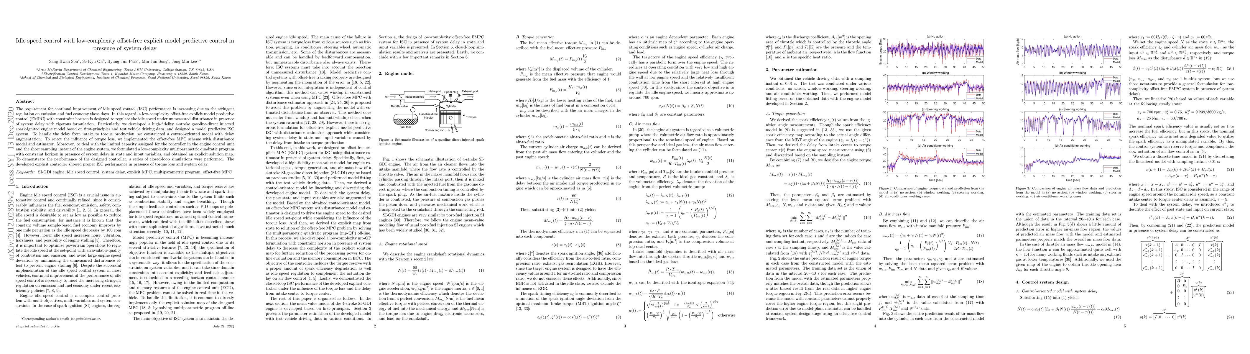 The requirement for continual improvement of idle speed control (ISC) performance is increasing due to the stringent regulation on emission and fuel economy these days. In this regard, a low-complexity offset-free explicit model predictive control (EMPC) with constraint horizon is designed to regulate the idle speed under unmeasured disturbance in presence of system delay with rigorous formulation. Particularly, we developed a high-fidelity 4-stroke gasoline-direct injected spark-ignited engine model based on first-principles and test vehicle driving data, and designed a model predictive ISC system. To handle the delay from intake to torque production, we constructed a control-oriented model with delay augmentation. To reject the influence of torque loss, we implemented the offset-free MPC scheme with disturbance model and estimator. Moreover, to deal with the limited capacity assigned for the controller in the engine control unit and the short sampling instant of the engine system, we formulated a low-complexity multiparametric quadratic program with constraint horizon in presence of system delay in state and input variables, and obtained an explicit solution map. To demonstrate the performance of the designed controller, a series of closed-loop simulations were performed. The developed explicit controller showed proper ISC performance in presence of torque loss and system delay.