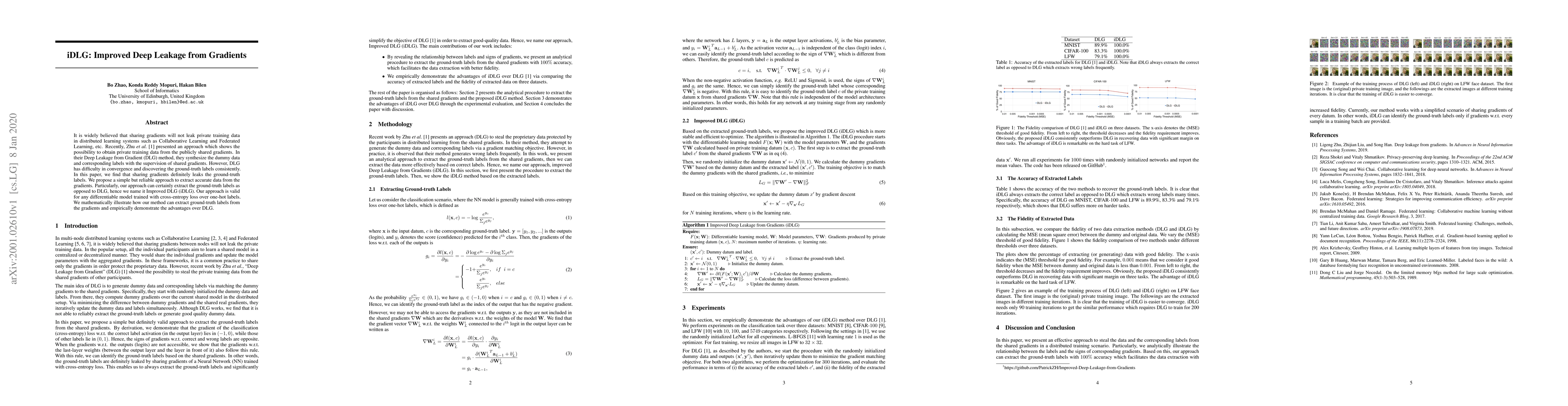 It is widely believed that sharing gradients will not leak private training data in distributed learning systems such as Collaborative Learning and Federated Learning, etc. Recently, Zhu et al. presented an approach which shows the possibility to obtain private training data from the publicly shared gradients. In their Deep Leakage from Gradient (DLG) method, they synthesize the dummy data and corresponding labels with the supervision of shared gradients. However, DLG has difficulty in convergence and discovering the ground-truth labels consistently. In this paper, we find that sharing gradients definitely leaks the ground-truth labels. We propose a simple but reliable approach to extract accurate data from the gradients. Particularly, our approach can certainly extract the ground-truth labels as opposed to DLG, hence we name it Improved DLG (iDLG). Our approach is valid for any differentiable model trained with cross-entropy loss over one-hot labels. We mathematically illustrate how our method can extract ground-truth labels from the gradients and empirically demonstrate the advantages over DLG.