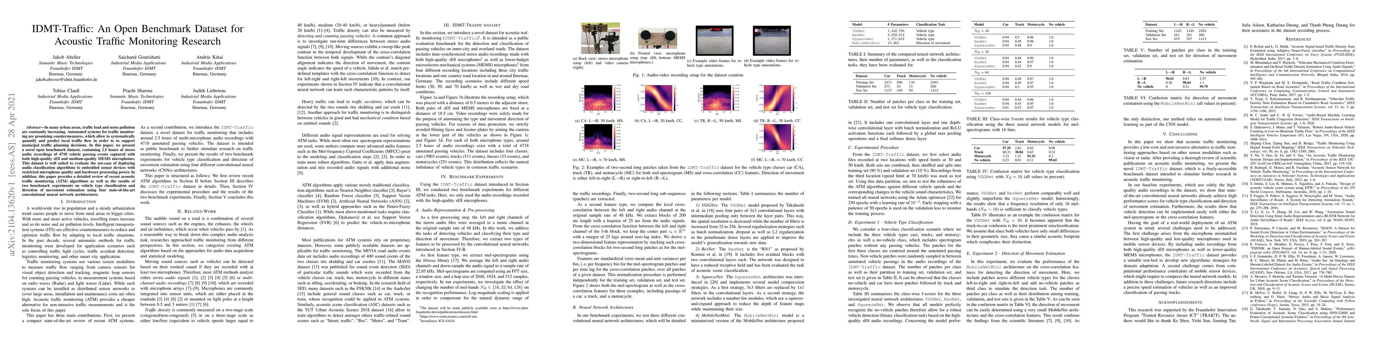 This paper introduces IDMT-Traffic, a new open dataset for acoustic traffic monitoring, featuring 2.5 hours of stereo audio recordings of 4,718 vehicle events. It aims to evaluate audio classification algorithms for embedded devices, and includes a review of recent acoustic traffic monitoring algorithms and benchmark experiments on vehicle classification and movement direction.