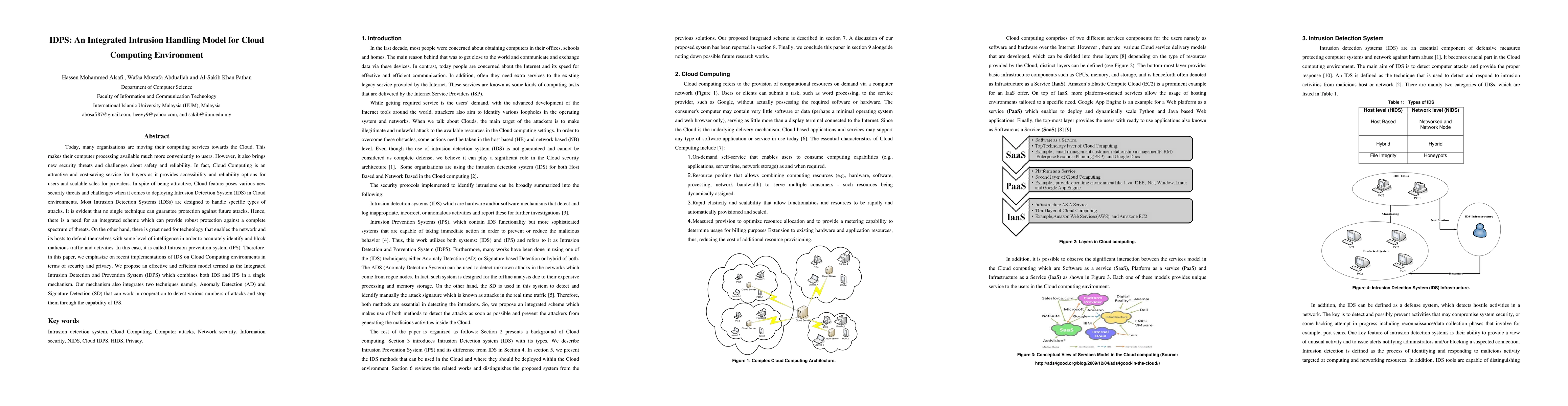 This paper proposes an Integrated Intrusion Detection and Prevention System (IDPS) for cloud environments, combining both Intrusion Detection Systems (IDS) and Intrusion Prevention Systems (IPS) to robustly address a spectrum of security threats. The model integrates Anomaly Detection and Signature Detection techniques to enhance detection and prevention capabilities.