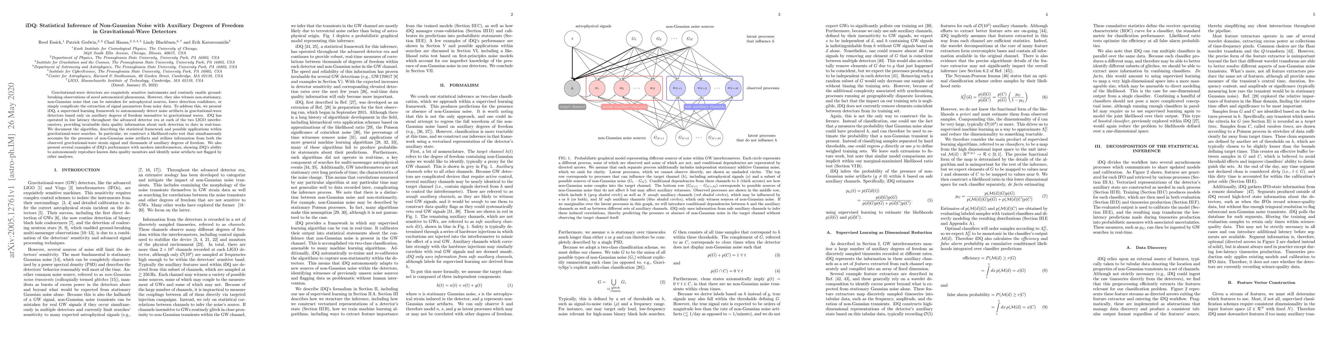 Gravitational-wave detectors are exquisitely sensitive instruments and routinely enable ground-breaking observations of novel astronomical phenomena. However, they also witness non-stationary, non-Gaussian noise that can be mistaken for astrophysical sources, lower detection confidence, or simply complicate the extraction of signal parameters from noisy data. To address this, we present iDQ, a supervised learning framework to autonomously detect noise artifacts in gravitational-wave detectors based only on auxiliary degrees of freedom insensitive to gravitational waves. iDQ has operated in low latency throughout the advanced detector era at each of the two LIGO interferometers, providing invaluable data quality information about each detection to date in real-time. We document the algorithm, describing the statistical framework and possible applications within gravitational-wave searches. In particular, we construct a likelihood-ratio test that simultaneously accounts for the presence of non-Gaussian noise artifacts and utilizes information from both the observed gravitational-wave strain signal and thousands of auxiliary degrees of freedom. We also present several examples of iDQ's performance with modern interferometers, showing iDQ's ability to autonomously reproduce known data quality monitors and identify noise artifacts not flagged by other analyses.