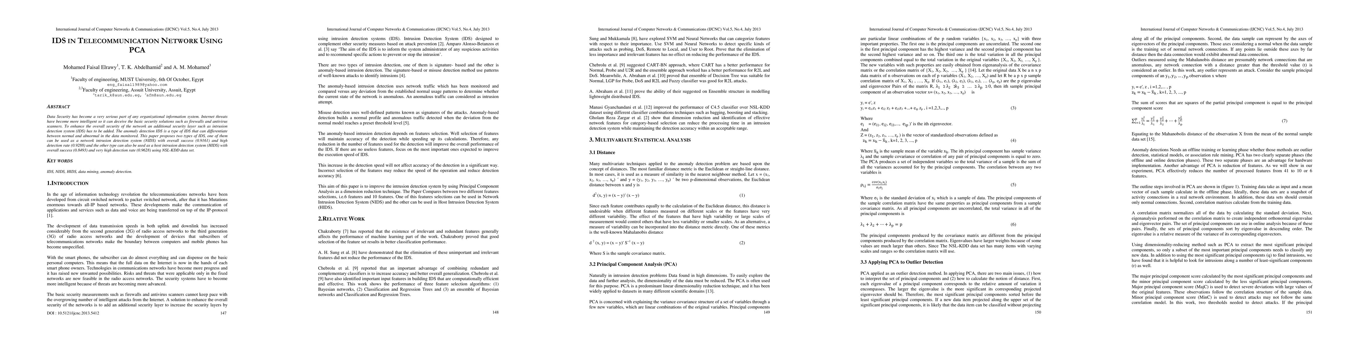 This paper proposes two types of intrusion detection systems (IDS) for telecommunication networks, utilizing Principal Component Analysis (PCA) for anomaly detection. The network intrusion detection system (NIDS) achieves 91.61% success and a 92.88% detection rate, while the host intrusion detection system (HIDS) attains 84.93% success and a 96.28% detection rate using the NSL-KDD dataset.