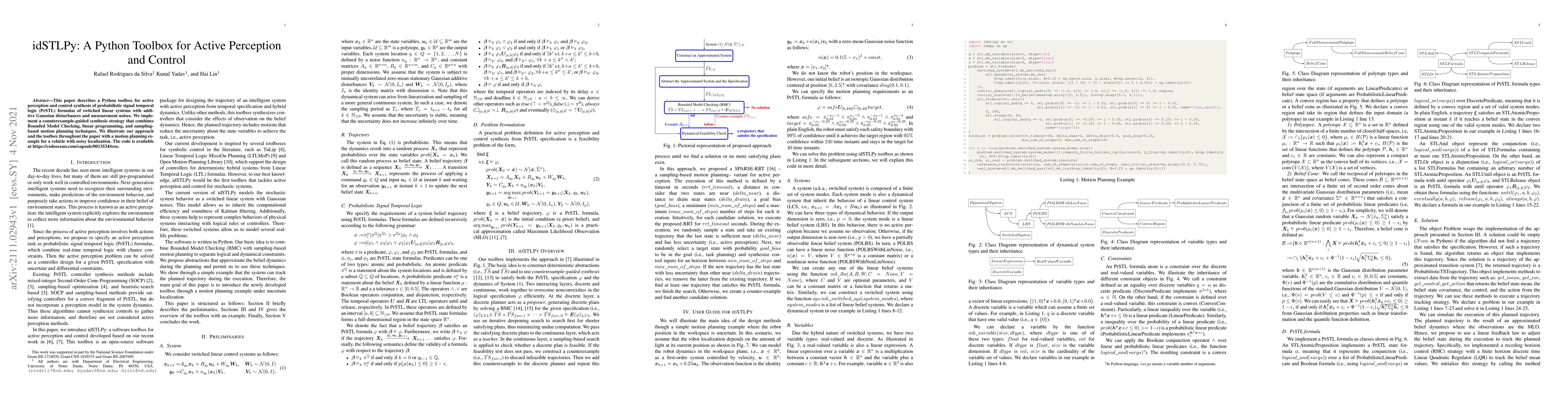 This paper introduces idSTLPy, a Python toolbox for synthesizing active perception and control strategies for switched linear systems using probabilistic signal temporal logic. It employs a combination of Bounded Model Checking, linear programming, and sampling-based motion planning, demonstrated through a vehicle motion planning example with noisy localization.