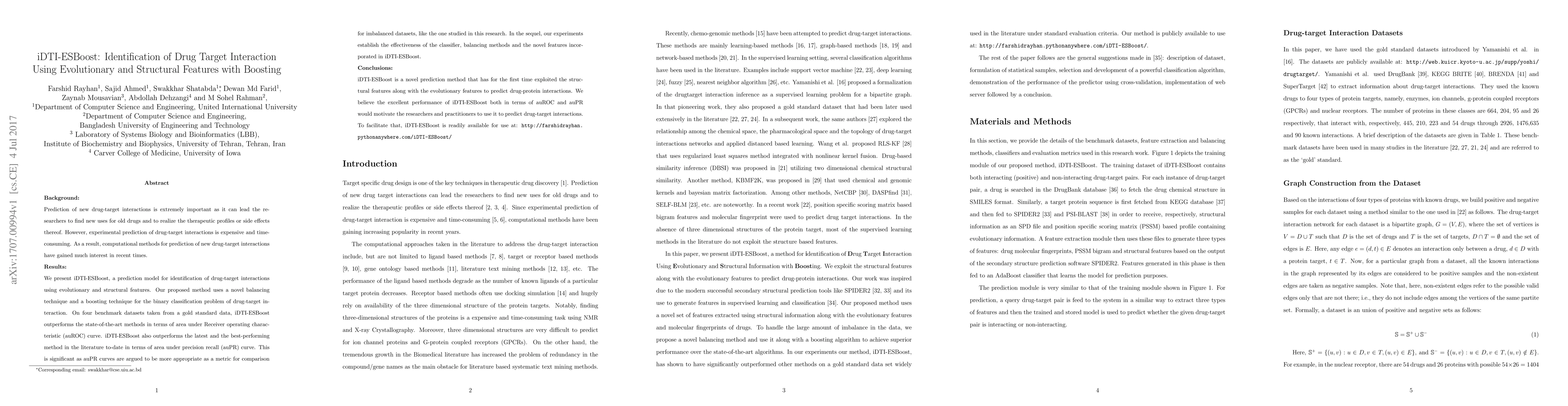 Prediction of new drug-target interactions is extremely important as it can lead the researchers to find new uses for old drugs and to realize the therapeutic profiles or side effects thereof. However, experimental prediction of drug-target interactions is expensive and time-consuming. As a result, computational methods for prediction of new drug-target interactions have gained much interest in recent times. We present iDTI-ESBoost, a prediction model for identification of drug-target interactions using evolutionary and structural features. Our proposed method uses a novel balancing technique and a boosting technique for the binary classification problem of drug-target interaction. On four benchmark datasets taken from a gold standard data, iDTI-ESBoost outperforms the state-of-the-art methods in terms of area under Receiver operating characteristic (auROC) curve. iDTI-ESBoost also outperforms the latest and the best-performing method in the literature to-date in terms of area under precision recall (auPR) curve. This is significant as auPR curves are argued to be more appropriate as a metric for comparison for imbalanced datasets, like the one studied in this research. In the sequel, our experiments establish the effectiveness of the classifier, balancing methods and the novel features incorporated in iDTI-ESBoost. iDTI-ESBoost is a novel prediction method that has for the first time exploited the structural features along with the evolutionary features to predict drug-protein interactions. We believe the excellent performance of iDTI-ESBoost both in terms of auROC and auPR would motivate the researchers and practitioners to use it to predict drug-target interactions. To facilitate that, iDTI-ESBoost is readily available for use at: http://farshidrayhan.pythonanywhere.com/iDTI-ESBoost/
