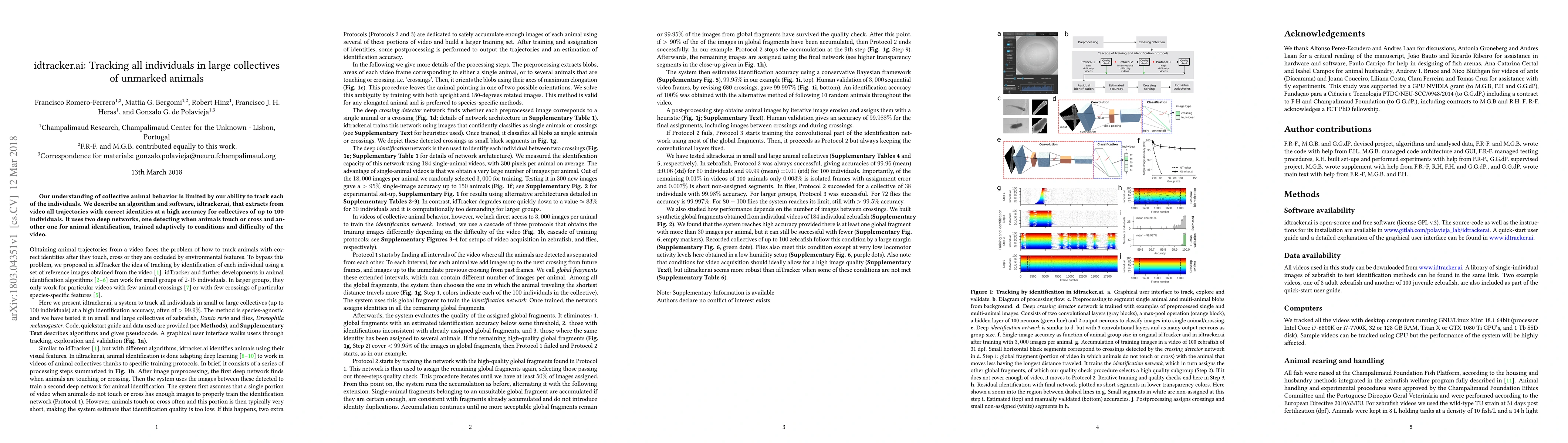Our understanding of collective animal behavior is limited by our ability to track each of the individuals. We describe an algorithm and software, idtracker.ai, that extracts from video all trajectories with correct identities at a high accuracy for collectives of up to 100 individuals. It uses two deep networks, one detecting when animals touch or cross and another one for animal identification, trained adaptively to conditions and difficulty of the video.